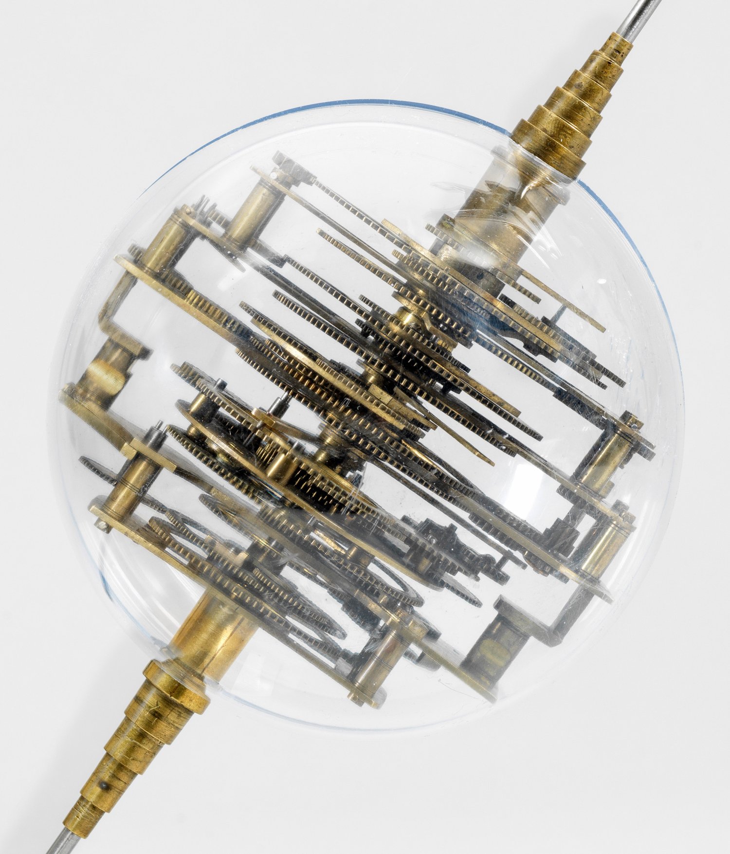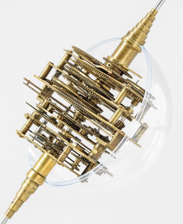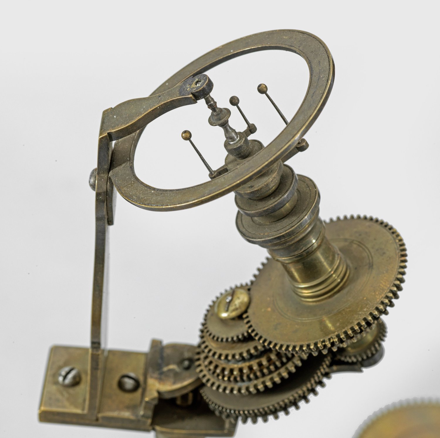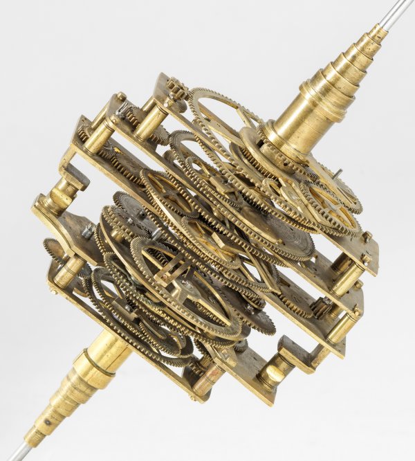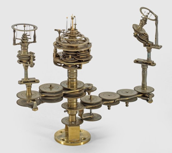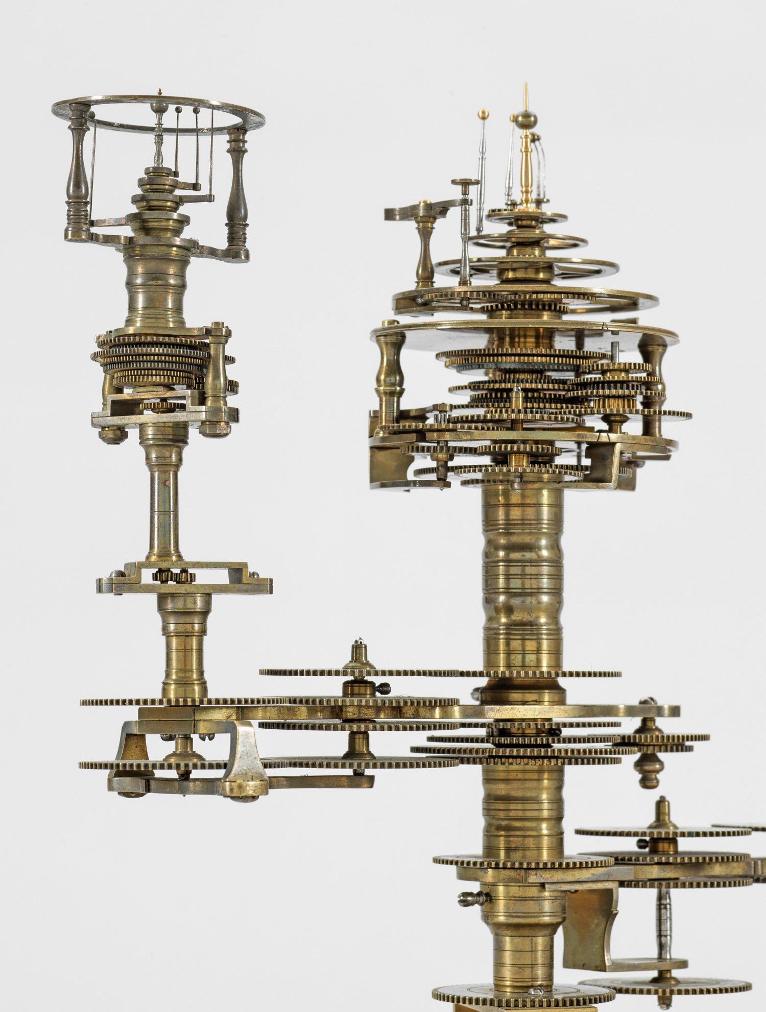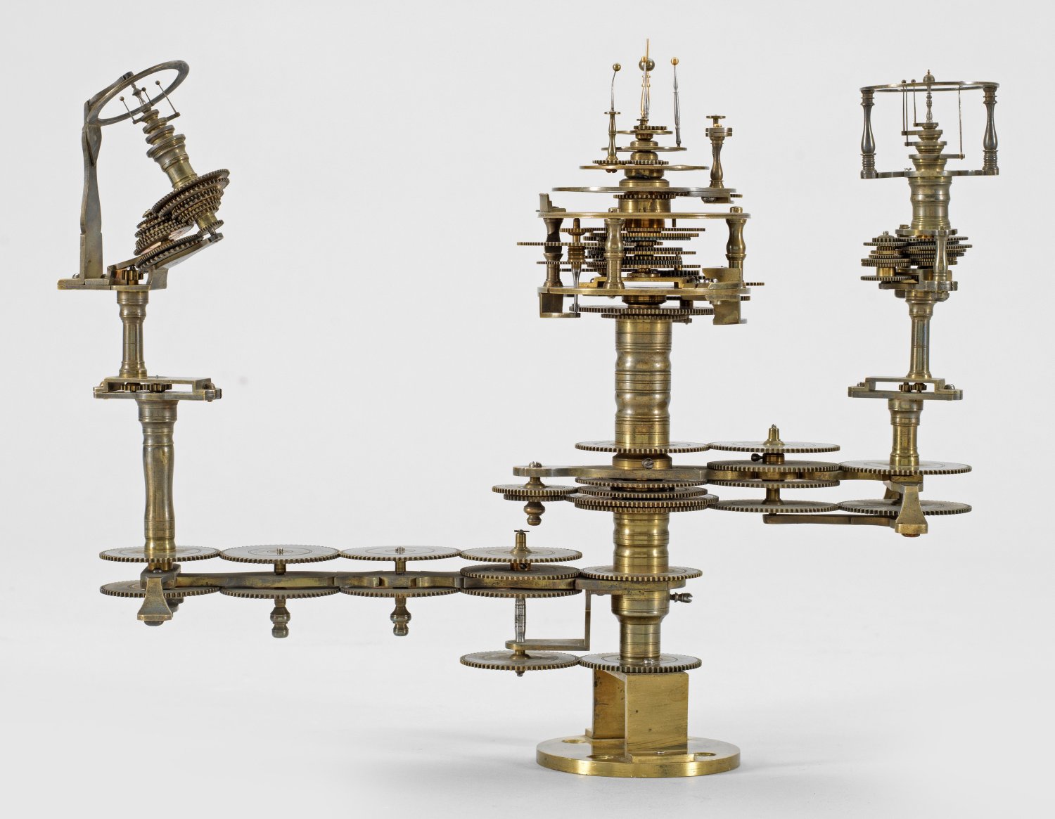 Messing und Stahl/Eisen. Die vorliegende "Weltmaschine" mit seiner astronomischen Uhr ist als feinmechanisches und naturwissenschaftliches Wunderwerk ein äußerst seltenes Objekt, das um 1780-1790 entstand. Außer dieser sind nur drei weitere "Weltmaschinen" in Museumsbesitz bekannt. Es besteht aus einem kopernikanischen Planetarium und dem Räderwerk für einen Himmelsglobus. Im Zentrum des kopernikanischen Systems werden die Bewegungen von Merkur, Venus, Erde, Mond und Mars angezeigt, mittig die auf einer Stange montierte Sonne. Auf einem seitlichen Ausleger befindet sich das Jupitersystem mit vier Monden; gegenüberliegend - mit geneigter Achse - sitzt das Saturnsystem, wobei der Ringplanet von fünf Monden umgeben ist. Die zusammengehörigen Bestandteile stehen aufgrund der frappanten, bis in die Details gehende Ähnlichkeit in direktem Zusammenhang mit einer Riss-Schnittzeichnung eines kopernikanischen Systems nach einem Entw. von Philipp Matthäus Hahn (in der Württembergischen Landesbibliothek in Stuttgart, Cod. Math. 2° 34, fol. 1), außerdem mit der von Hahn 1780 gebauten berühmten sog. "Weltmaschine" im Schlossmuseum der Stiftung Schloss Friedenstein in Gotha (Inv.-Nr. 72/4576). Rest.; H. 35 cm.