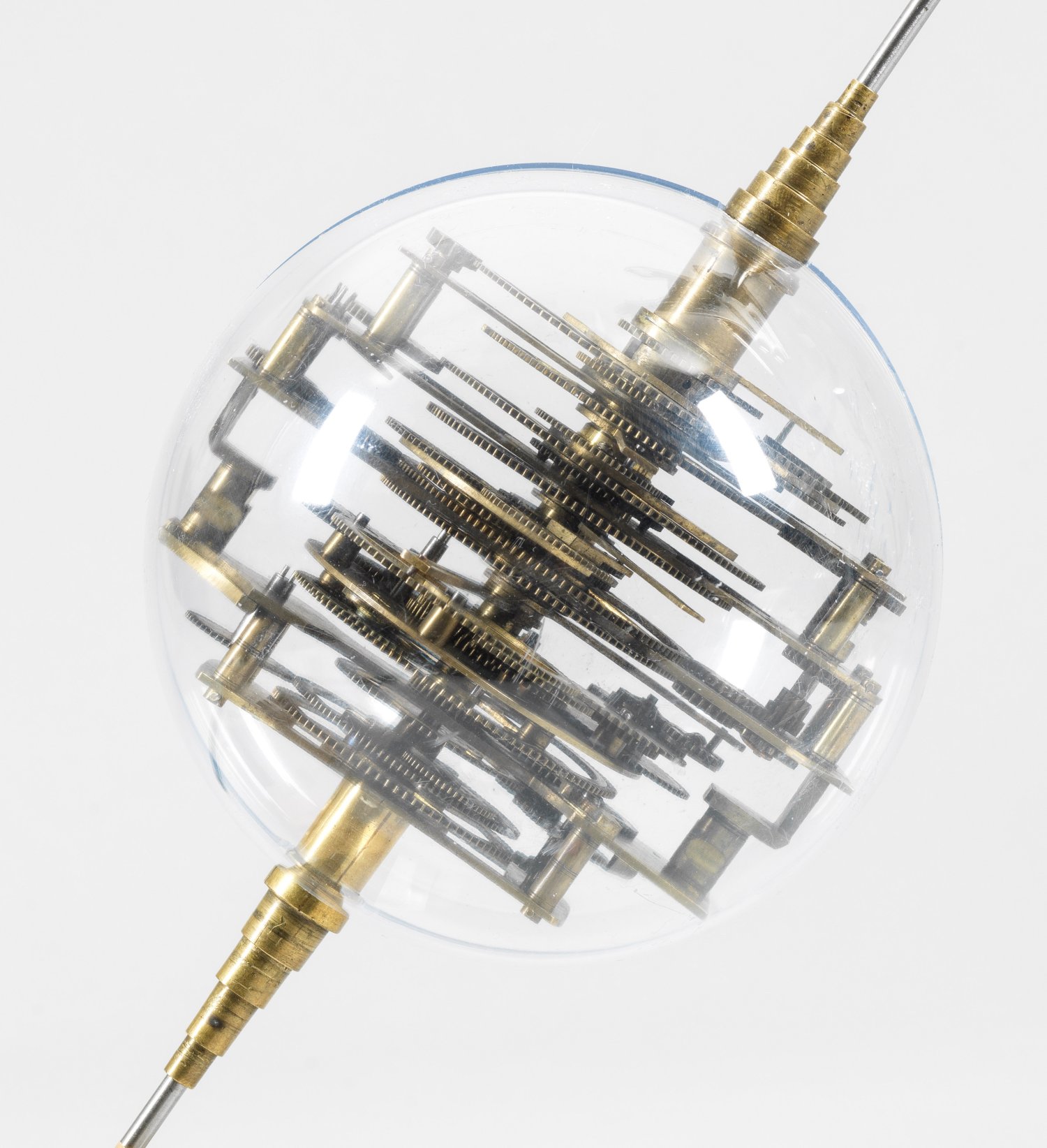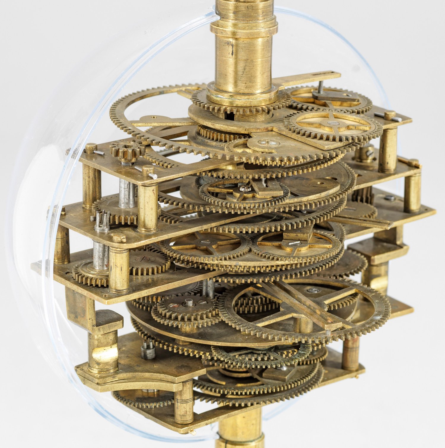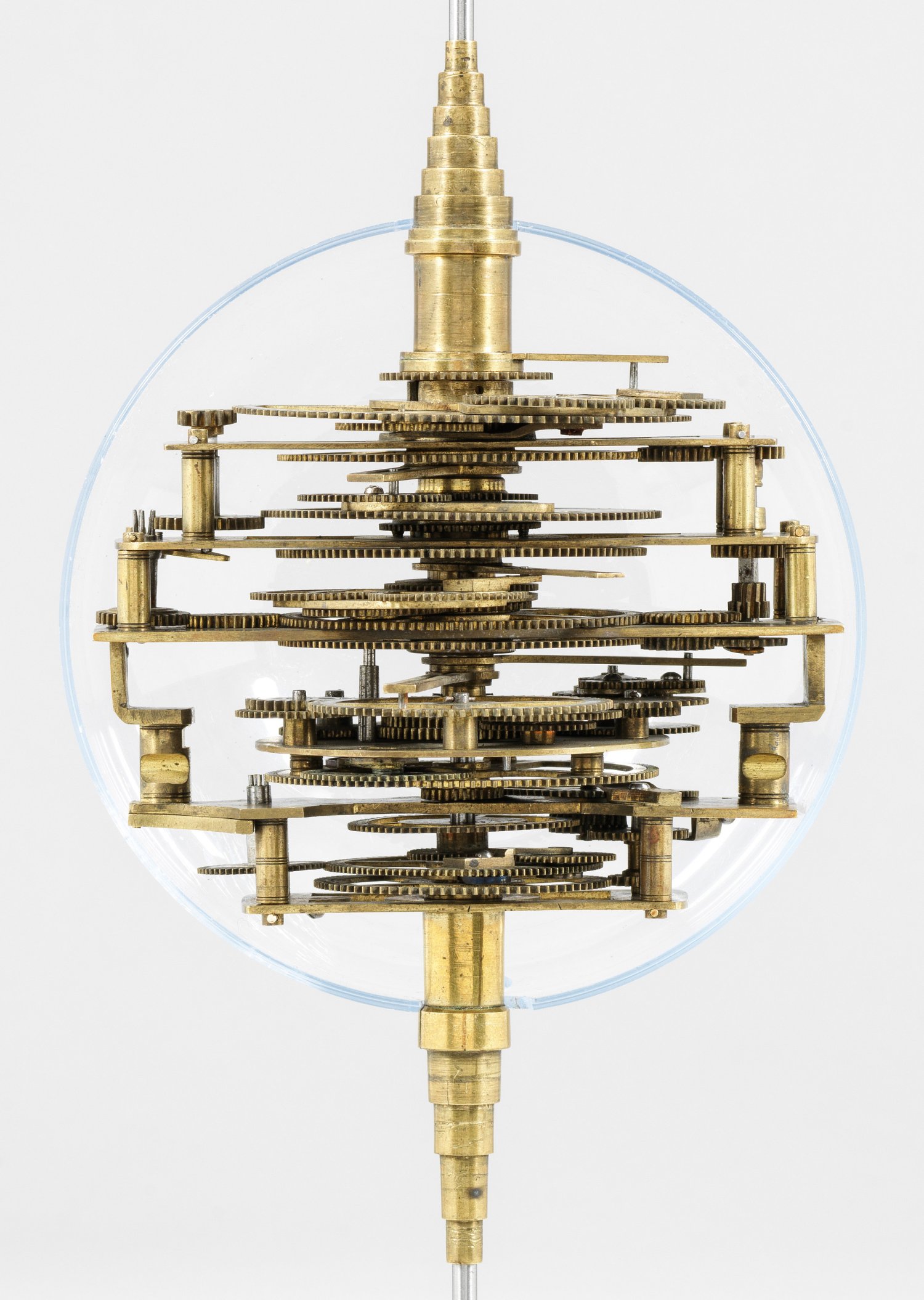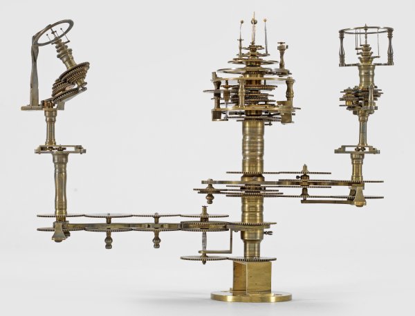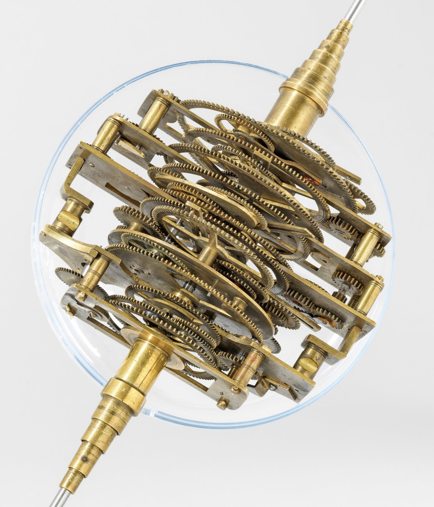 Messing und Stahl/Eisen. Die vorliegende "Weltmaschine" mit seiner astronomischen Uhr ist als feinmechanisches und naturwissenschaftliches Wunderwerk ein äußerst seltenes Objekt, das um 1780-1790 entstand. Außer dieser sind nur drei weitere "Weltmaschinen" in Museumsbesitz bekannt. Es besteht aus einem kopernikanischen Planetarium und dem Räderwerk für einen Himmelsglobus. Im Zentrum des kopernikanischen Systems werden die Bewegungen von Merkur, Venus, Erde, Mond und Mars angezeigt, mittig die auf einer Stange montierte Sonne. Auf einem seitlichen Ausleger befindet sich das Jupitersystem mit vier Monden; gegenüberliegend - mit geneigter Achse - sitzt das Saturnsystem, wobei der Ringplanet von fünf Monden umgeben ist. Die zusammengehörigen Bestandteile stehen aufgrund der frappanten, bis in die Details gehende Ähnlichkeit in direktem Zusammenhang mit einer Riss-Schnittzeichnung eines kopernikanischen Systems nach einem Entw. von Philipp Matthäus Hahn (in der Württembergischen Landesbibliothek in Stuttgart, Cod. Math. 2° 34, fol. 1), außerdem mit der von Hahn 1780 gebauten berühmten sog. "Weltmaschine" im Schlossmuseum der Stiftung Schloss Friedenstein in Gotha (Inv.-Nr. 72/4576). Rest.; H. 35 cm.