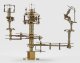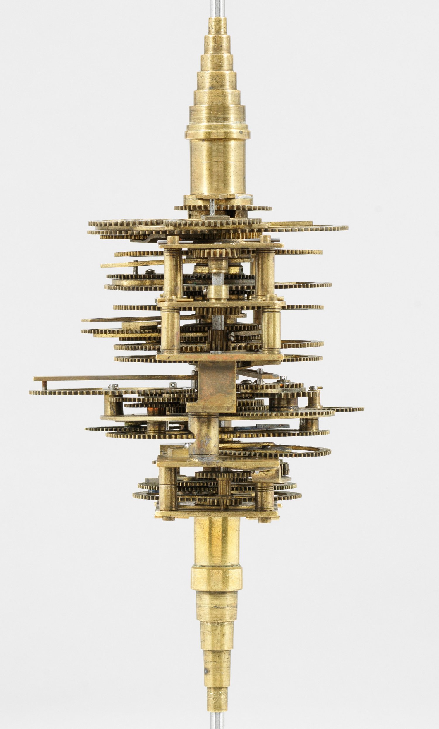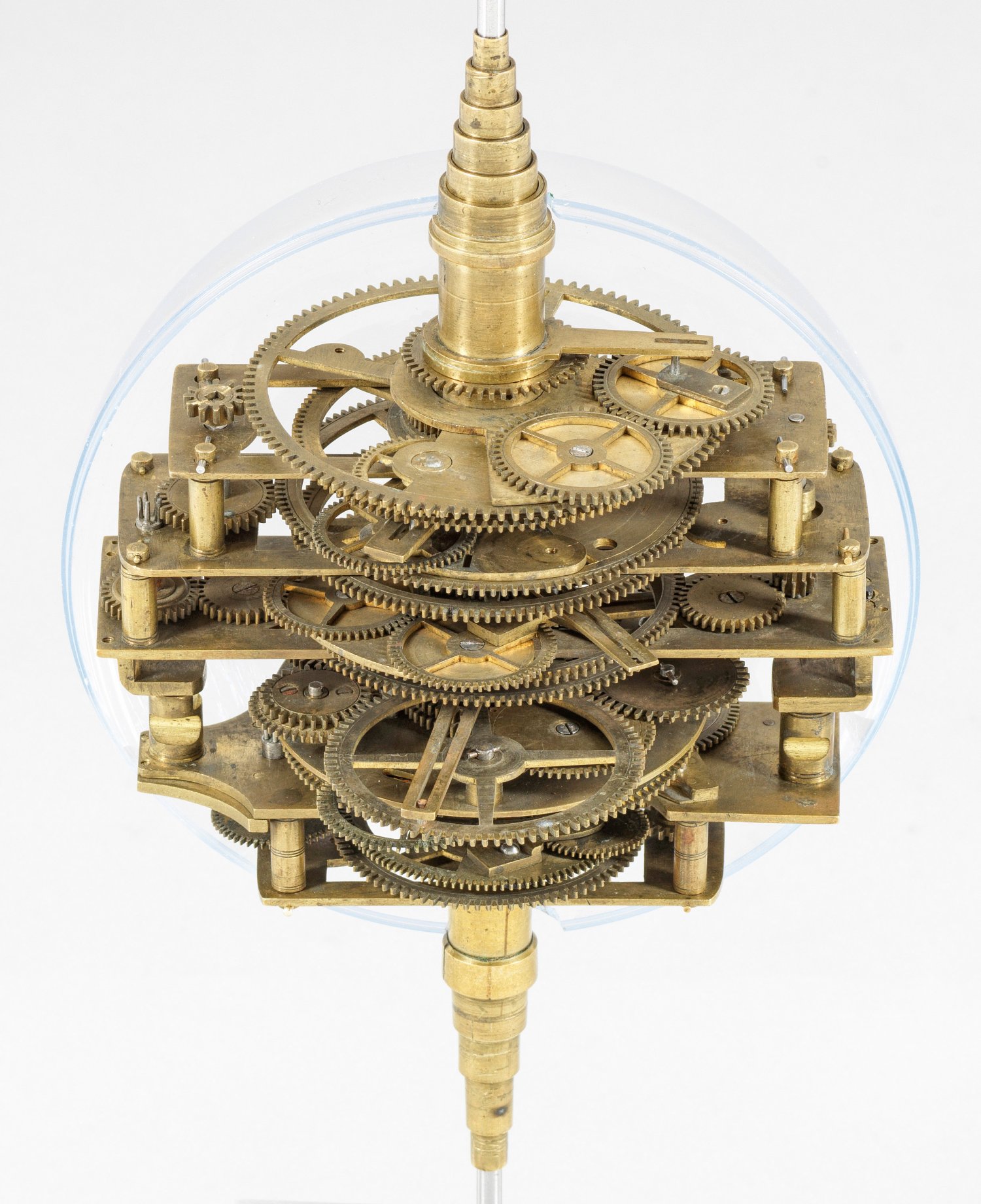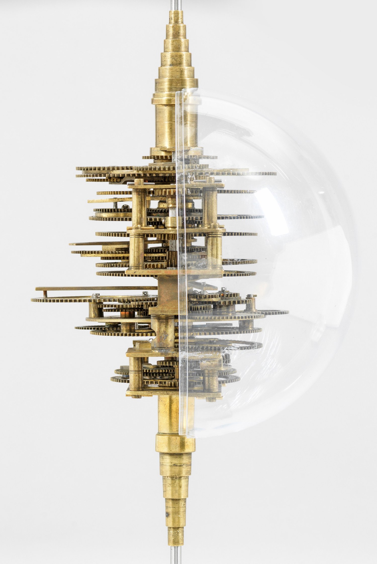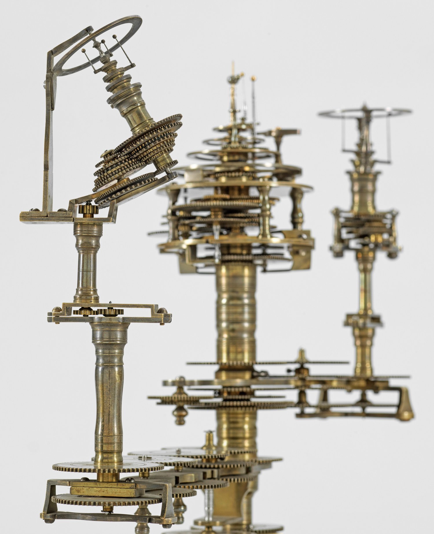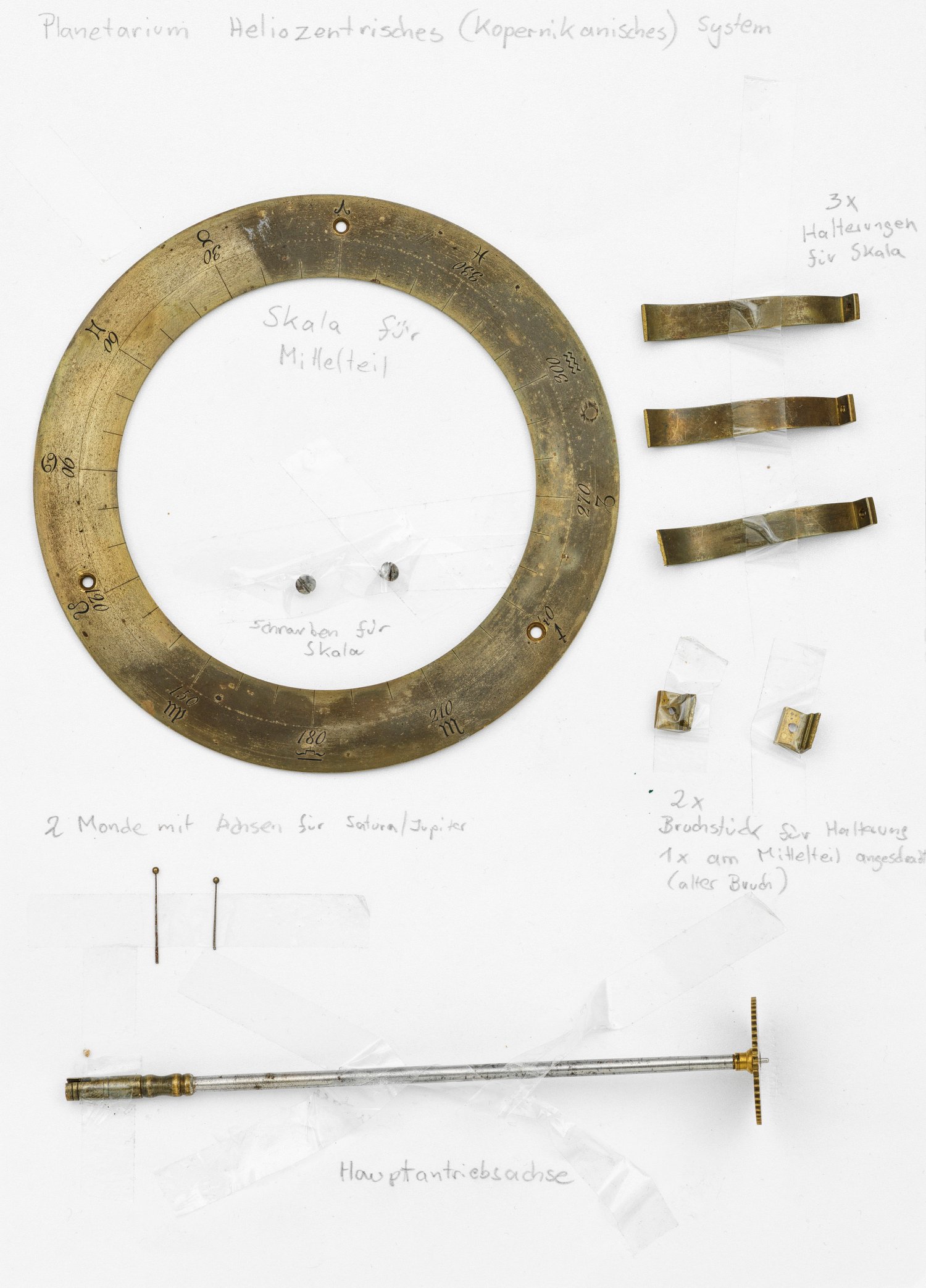 Messing und Stahl/Eisen. Die vorliegende "Weltmaschine" mit seiner astronomischen Uhr ist als feinmechanisches und naturwissenschaftliches Wunderwerk ein äußerst seltenes Objekt, das um 1780-1790 entstand. Außer dieser sind nur drei weitere "Weltmaschinen" in Museumsbesitz bekannt. Es besteht aus einem kopernikanischen Planetarium und dem Räderwerk für einen Himmelsglobus. Im Zentrum des kopernikanischen Systems werden die Bewegungen von Merkur, Venus, Erde, Mond und Mars angezeigt, mittig die auf einer Stange montierte Sonne. Auf einem seitlichen Ausleger befindet sich das Jupitersystem mit vier Monden; gegenüberliegend - mit geneigter Achse - sitzt das Saturnsystem, wobei der Ringplanet von fünf Monden umgeben ist. Die zusammengehörigen Bestandteile stehen aufgrund der frappanten, bis in die Details gehende Ähnlichkeit in direktem Zusammenhang mit einer Riss-Schnittzeichnung eines kopernikanischen Systems nach einem Entw. von Philipp Matthäus Hahn (in der Württembergischen Landesbibliothek in Stuttgart, Cod. Math. 2° 34, fol. 1), außerdem mit der von Hahn 1780 gebauten berühmten sog. "Weltmaschine" im Schlossmuseum der Stiftung Schloss Friedenstein in Gotha (Inv.-Nr. 72/4576). Rest.; H. 35 cm.