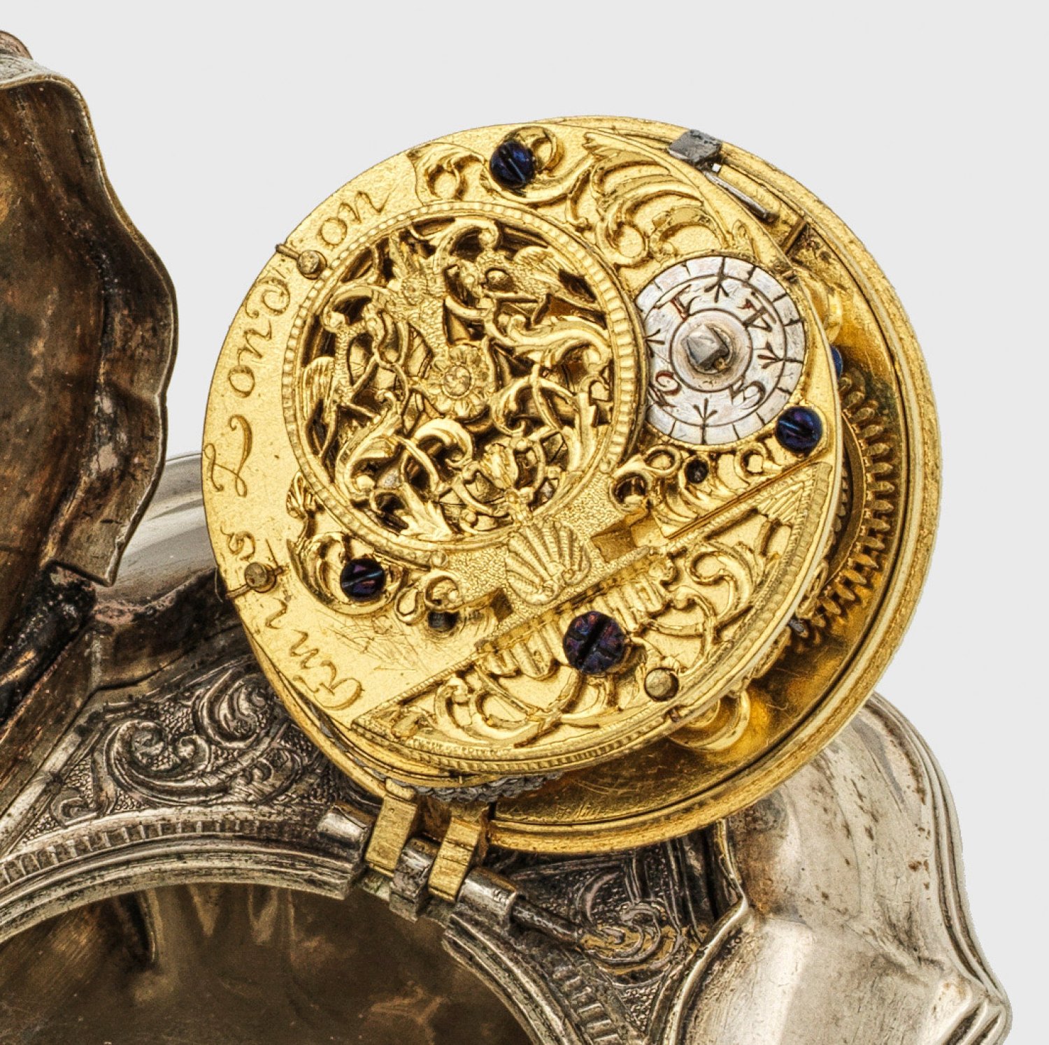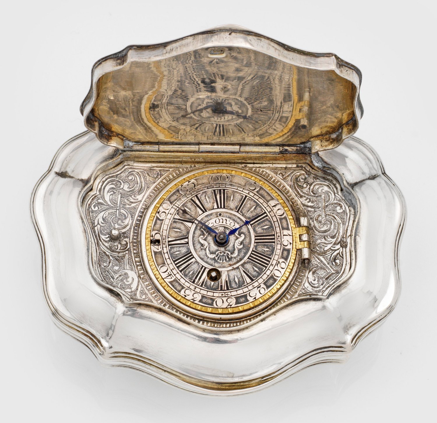 Augsburg. Um 1730/40. Silber, österreichischer Repunzierungsstempel von 1806/07 mit Stadtkennung von Prag. Geschweifter, passiger Korpus mit gegrateter, getreppter und profilierter Wandung und doppelt scharniertem Deckel. Innenvergoldung. Unter dem oberen Deckel auf fein punziertem und graviertem Grund die versteckt eingearbeitete Spindeltaschenuhr. Champléve-Zifferblatt mit römischen Stunden und arabischer Minuterie, gebläuten Scoties-Zeigern über mit Muschel und Schwüngen dekoriertem Zentrum mit Ortsbez. "Lond(on).". Vergoldetes Vollplatinenwerk mit dreiarmiger Messingunruh unter vegetabil gearbeiteter Unruhbrücke in Ajour, Kette und Schnecke sowie Spindelhemmung. Platine sign. "Gnis London". Ges.-Gew. 170 g. H. 3,5 cm. 8,5 x 6,5 cm. D. ca. 35 mm (Uhr).