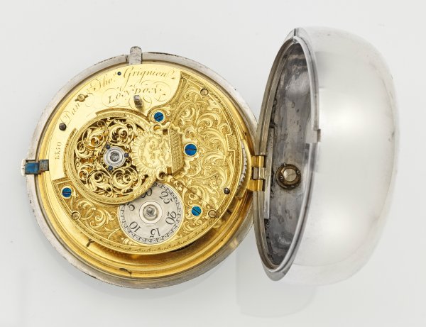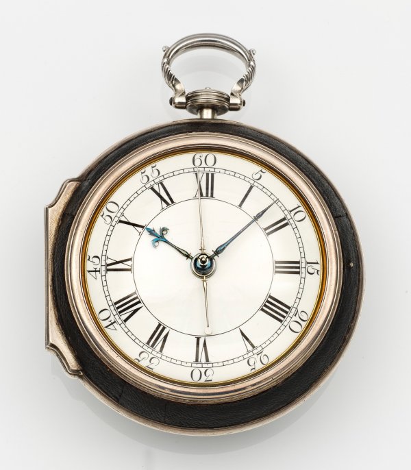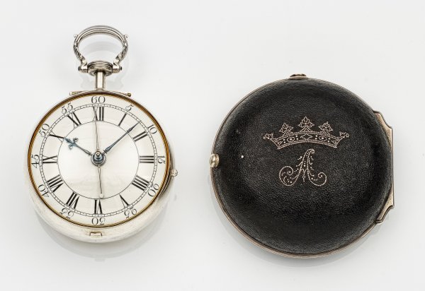 England. London. Um 1753. Silber, gest. mit Länder-/Stadtbeschau, Jahresbuchstabe (leicht verschlagen) und Meisterpunze des Gehäusemachers E. Renou (reg. Mai 1735). Übergehäuse mit schwarzem Haifischhautbelag und mit filigranen Silbernägeln gestaltetem Zierbuchstaben "A" unter niederländischer Marquiskrone. Glattes Innengehäuse. Weißes Emailzifferblatt mit römischen Stunden und arabischer Minuterie, gebläuten "Poker & Beetle"-Zeigern und Zentralsekunde mit seitlichem Schieber zum Stoppen. Fein graviertes, vergoldetes Werk mit Spindelhemmung, Kette und Schnecke. Werk und Werkschutzkappe signiert und num. 1350. Ges.-Gew. ca. 1090,7 g. D. ca. 11,5 cm.