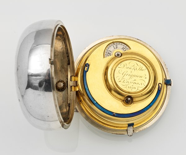 A double-cased verge watch by Daniel and Thomas Grignion, London circa 1753. Cases in silver, one encased with shark leather. Gilt mechanical movement with protection cover. Platine and protection cap signed and numbered 1350.
