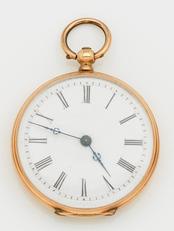 19. Jh.; Gelbgold, gest. 14 k. Offenes Gehäuse mit Champléve-Ornamentik auf guillochiertem Grund. Vergoldete Kupfercuvette. Weißes Emailzifferblatt mit römischen Indices und Fleur-de-Lys-Zeigern. Brückenwerk mit Zylinderhemmung und Schlüsselaufzug. Nr. 7139. Gew. ca. 22,55 g. D. 31,5 mm.