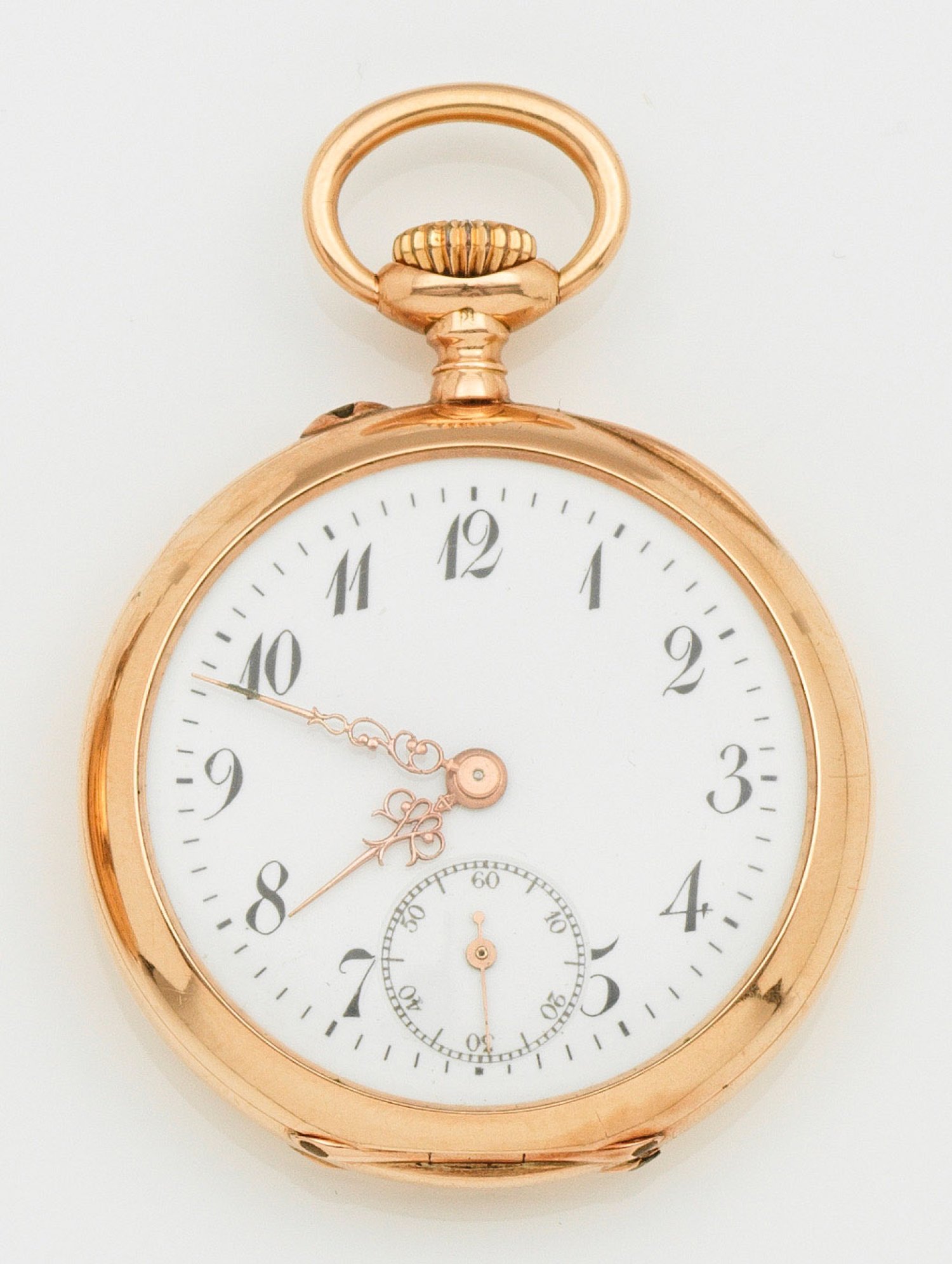 Schweiz. Genf. Um 1900. Gelbgold, gest. 585. Offenes, glattes Gehäuse mit Ziermonogramm. Goldcuvette. Weißes Emailzifferblatt mit arabischen Indices, kleiner Sekunde und vergoldeten Louis-XVI-Zeigern. Brückenwerk mit Kompensationsunruh, Ankerhemmung und Kronenaufzug. Nr. 36268. Herstellerzeichen. Gew. ca. 26,48 g. D. 32 mm.