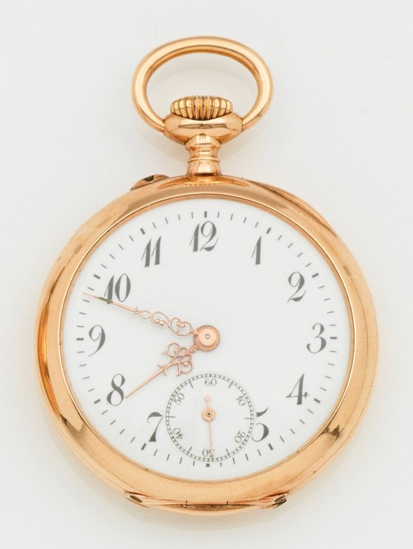 Pocket watch by A. Hüning, Geneva circa 1900. Case and dome in 14 k gold. Mechanical movement with crown wind, numbered. Manufacturer's mark.