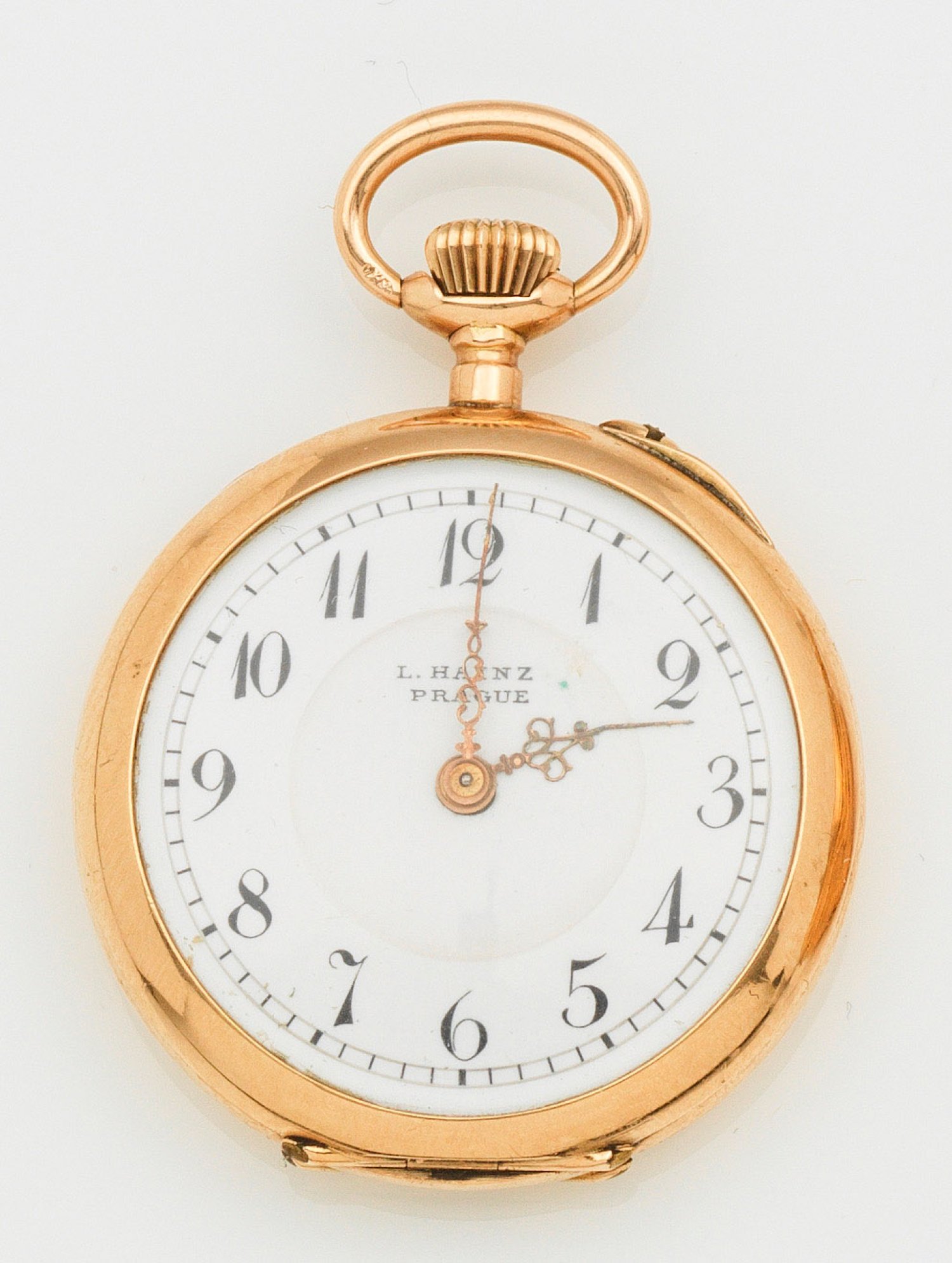Pocket watch by L. Hainz Prague, Czechia and Switzerland circa 1900. Case and dome in 14 k gold. Mechanical movement with crown wind, numbered.