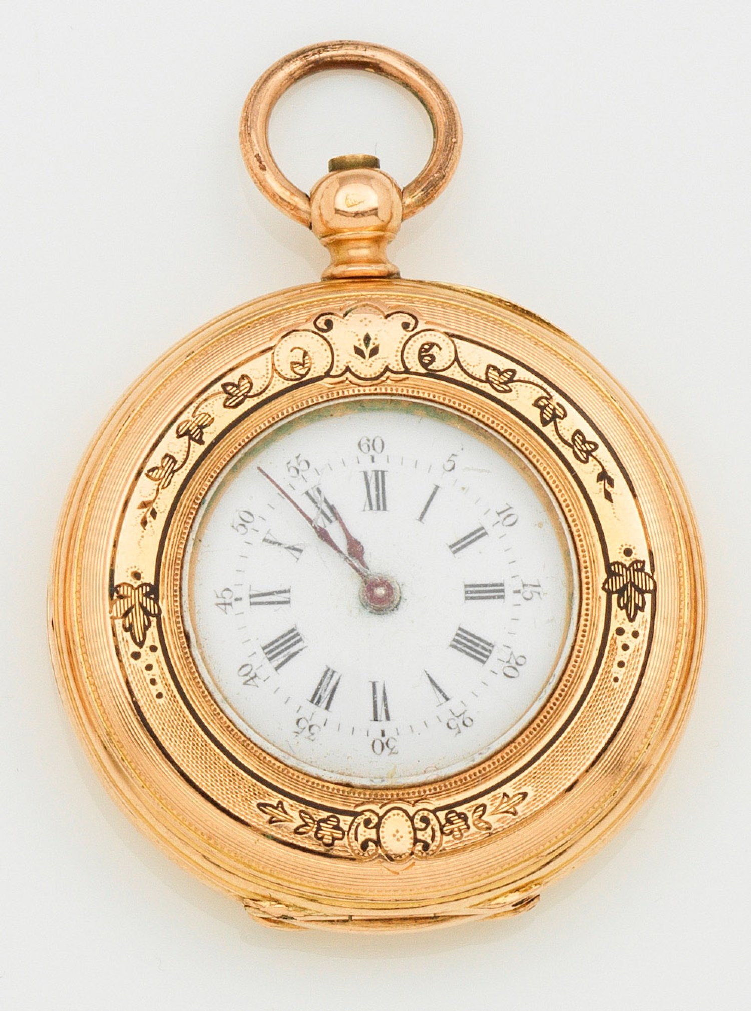 Frankreich. Um 1900. Gelbgold, 14 k. Halboffenes, guillochiertes Gehäuse mit vegetabilem Champlévedekor und passiger Kartusche. Weißes Emailzifferblatt mit römischen Stunden, arabischer Minuterie und gebläuten, birnförmigen Zeigern. Gravierte Goldcuvette. Brückenwerk mit Zylinderhemmung und Schlüsselaufzug. Nr. 12927. Gew. ca. 27,04 g. D. 33 mm.
