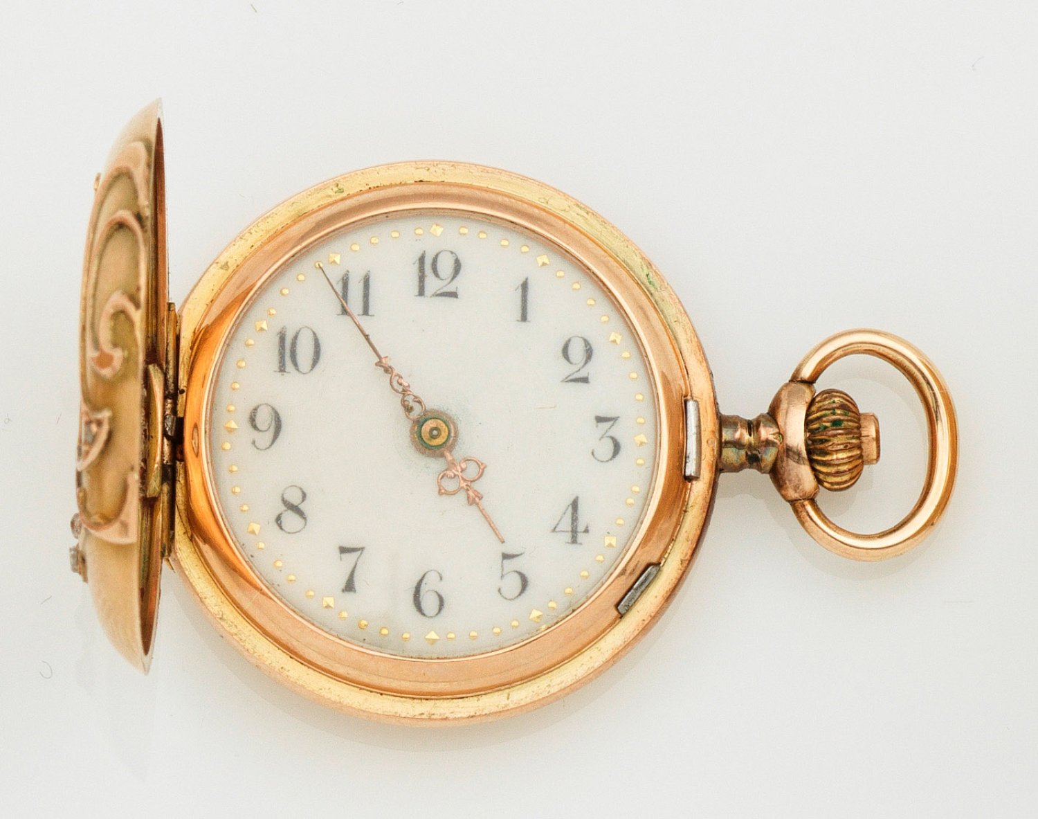 Schweiz. Um 1900. Gelbgold, gest. 585. Glattes Savonettegehäuse mit aufgelegten Zweigen, besetzt mit einem Diamant und Diamantrosen. Goldcuvette. Weißes Emailzifferblatt mit arabischen Indices und vergoldeten Louis-XVI-Zeigern. Brückenwerk mit Zylinderhemmung und Kronenaufzug. Nr. 82730. Herstellerzeichen. Gew. ca. 20,40 g. D. 29 mm.