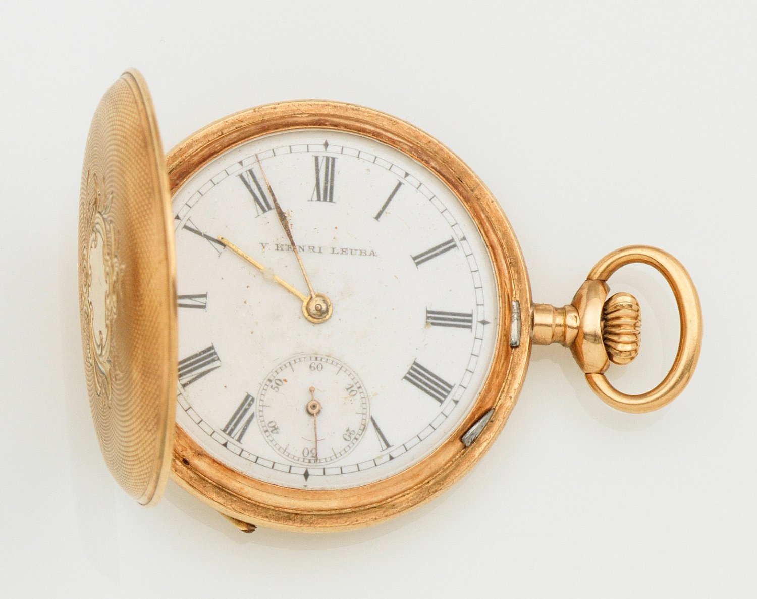 Pocket watch by V. Henri Leuba, Switzerland circa 1920. Savonette case and dome in 14 k gold. Mechanical movement with crown wind, numbered. Manufacturer's mark.