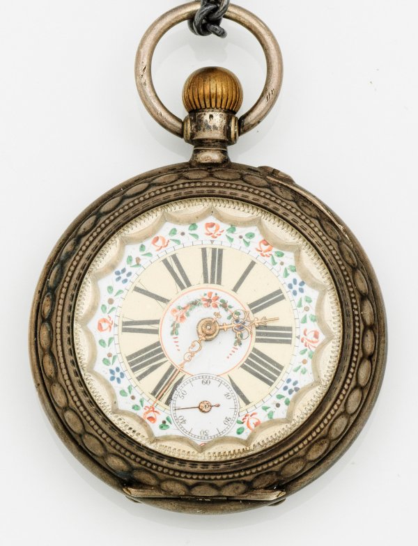Schweiz. Um 1900. Silber, gest. 800. Halboffenes Gehäuse mit gewellter Lünette und graviertem springendem Pferd. Metallcuvette. Weißes Emailzifferblatt mit elfenbeinfarben abgesetztem Zifferring mit römischen Indices, kleiner Sekunde, vergoldeten Louis-XVI-Zeigern und feiner Blumenstaffage. Brückenwerk mit Zylinderhemmung und Kronenaufzug. Ankerkette in Silber (gest. 925). Kettenlänge ca. 70 cm. Ges.-Gew. ca. 124,5 g. D. 49,5 mm.