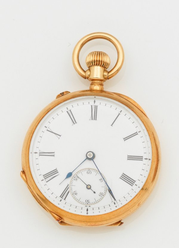 Deutschland, Glashütte. Um 1890. Gelbgold, gest. 18 k. Offenes Uhrengehäuse mit Monogrammgravur. Glatte Goldcuvette. Weißes Emailzifferblatt mit römischen Indices, kleiner Sekunde und gebläuten birnförmigen Zeigern. Vergoldetes 1/3-Platinenwerk mit Kompensationsunruh, Ankerhemmung und Kronenaufzug. Nr. 22519. Herstellerzeichen. Gew. ca. 39,67 g. D. 36 mm.