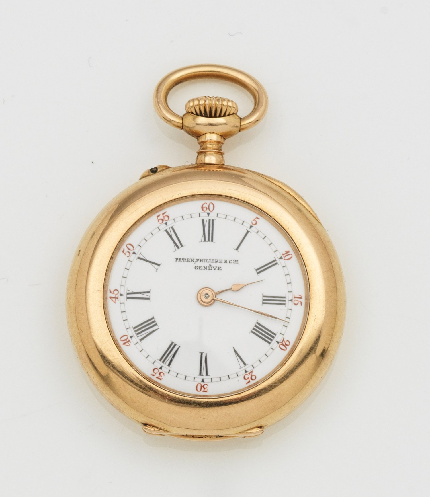 Pocket watch by Patek Philippe, Geneva circa 1900/05. Case and dome in 18 k gold, numbered. Mechanical movement with crown wind, numbered. Manufacturer's mark.
