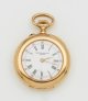 Schweiz. Genf. Um 1900/05. Gelbgold, gest. 750. Glattes, offenes Uhrengehäuse mit breiter Lünette. Gravierte Goldcuvette. Weißes Emailzifferblatt mit römischen Stunden, arabischer Minuterie und schlanken, birnförmigen Zeigern. Mechanisches ½-Platinenwerk mit Kompensationsunruh, Ankerhemmung und Kronenaufzug. Werk-Nr. 116355, Gehäuse-Nr. 227741. Herstellerzeichen. Gew. ca. 29,32 g. D. 31,5 mm.