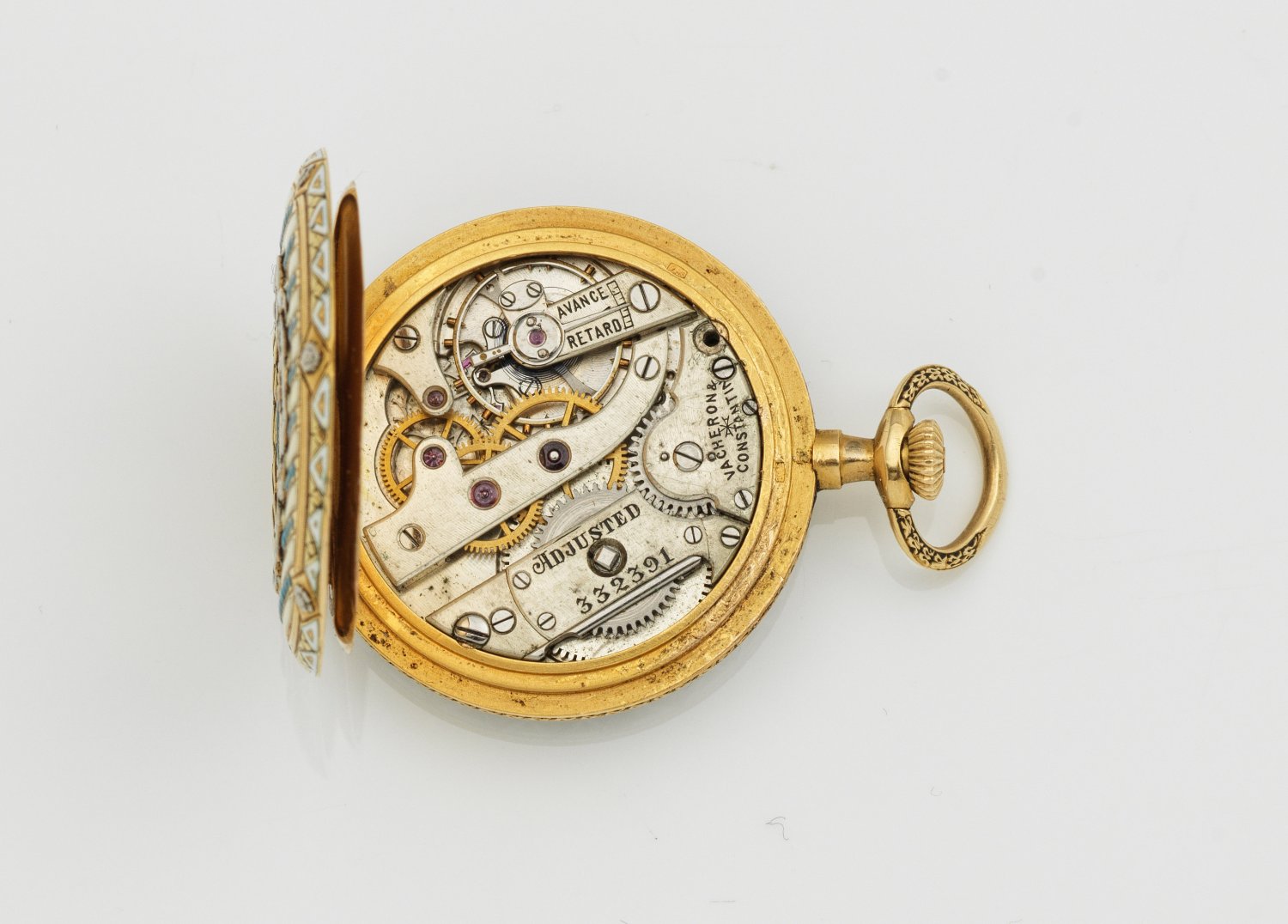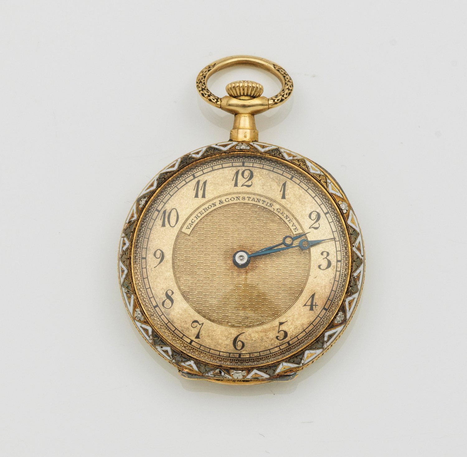 Women's pocket watch by Vacheron & Constantin, Geneva circa 1920. Enamelled case and dome in 18 k gold, numbered. Mechanical movement with crown winding, signed and numbered. Manufacturer's mark.