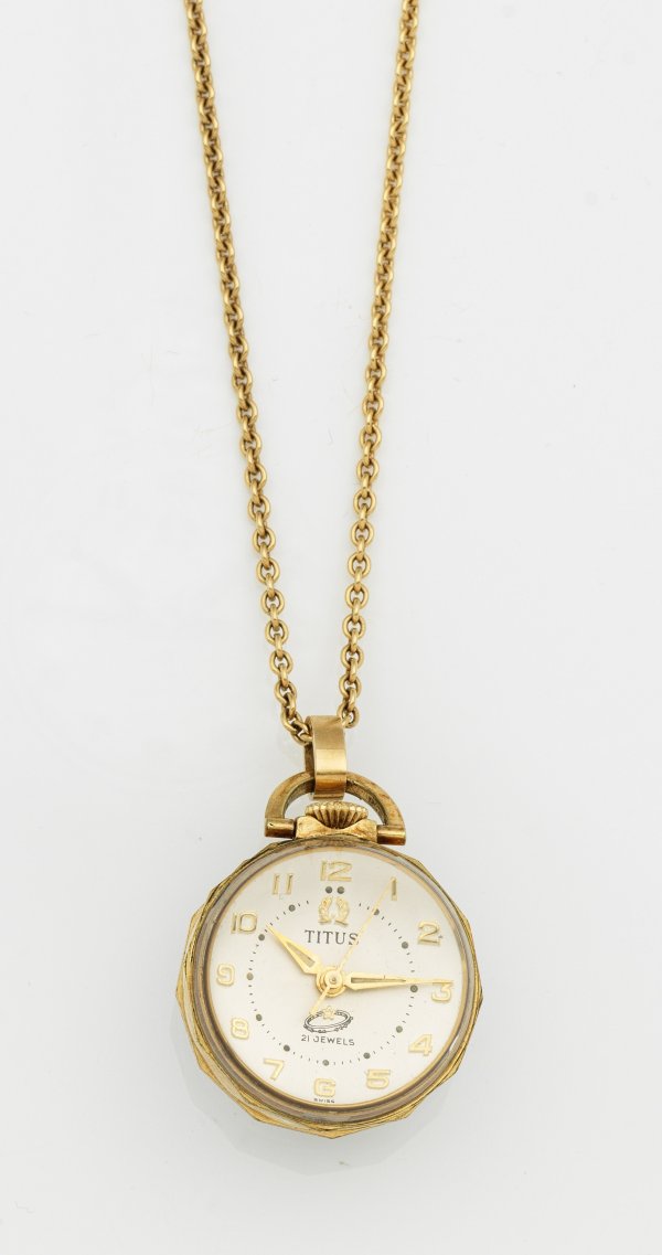 Pendant watch by TITUS Watch Co., Switzerland circa 1960. Glass and gilt metal. Mechanical movement with crown wind. Manufacturer's mark. Necklace in 18 k gold.