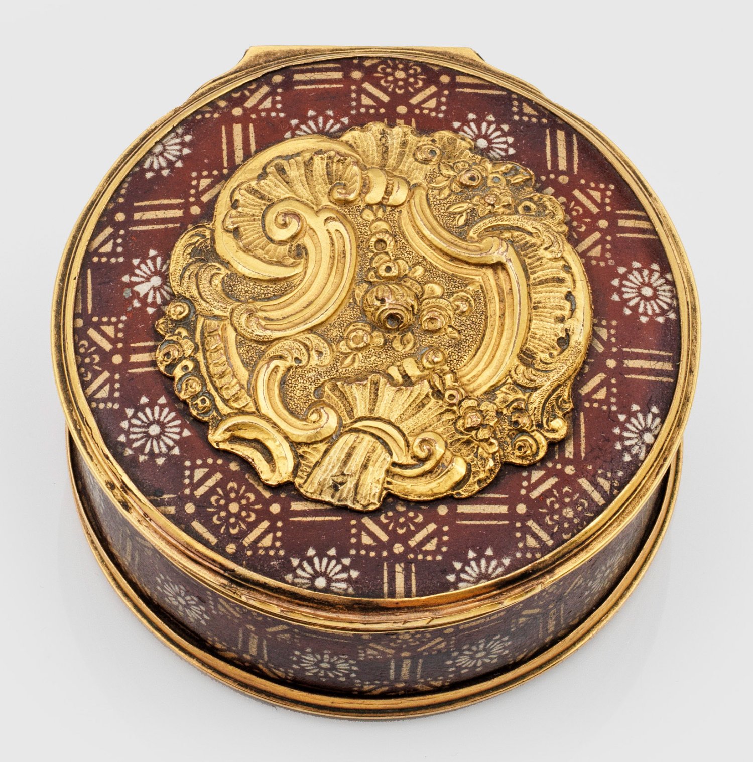 Metall lackiert mit vergoldeter Messingmontierung. Zylindrische Form mit gering gewölbtem Boden und scharniertem Deckel. Die Ränder umzogen von schmalem, mehrfach profiliertem Messingrahmen. Wandung, Boden und Deckel flächendeckend dunkelrot lackiert und mit symmetrisch angeordneten blüten- und stabförmigen Ornamenten verziert. Auf dem Deckel ein zentral appliziertes Relief aus erhabenen Rocaillen, C-Schwüngen und Rosenblüten über strukturiertem Grund. Schauseitig passig geschweifter Drücker. Innen mit Zinnverkleidung sowie vergoldeter Deckelinnenseite. H. 3,5 cm. D. 6,6 cm.