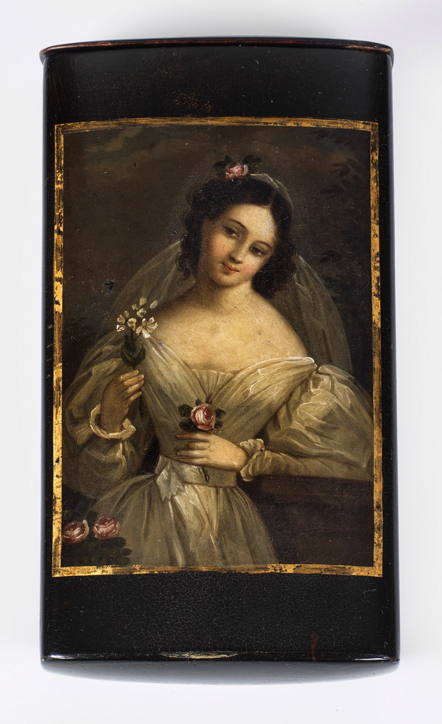 A rare Brunswick paper-mache cigar case with the portrait of a young bride. Titled and manufacturer's mark. Minor age-related signs of use.