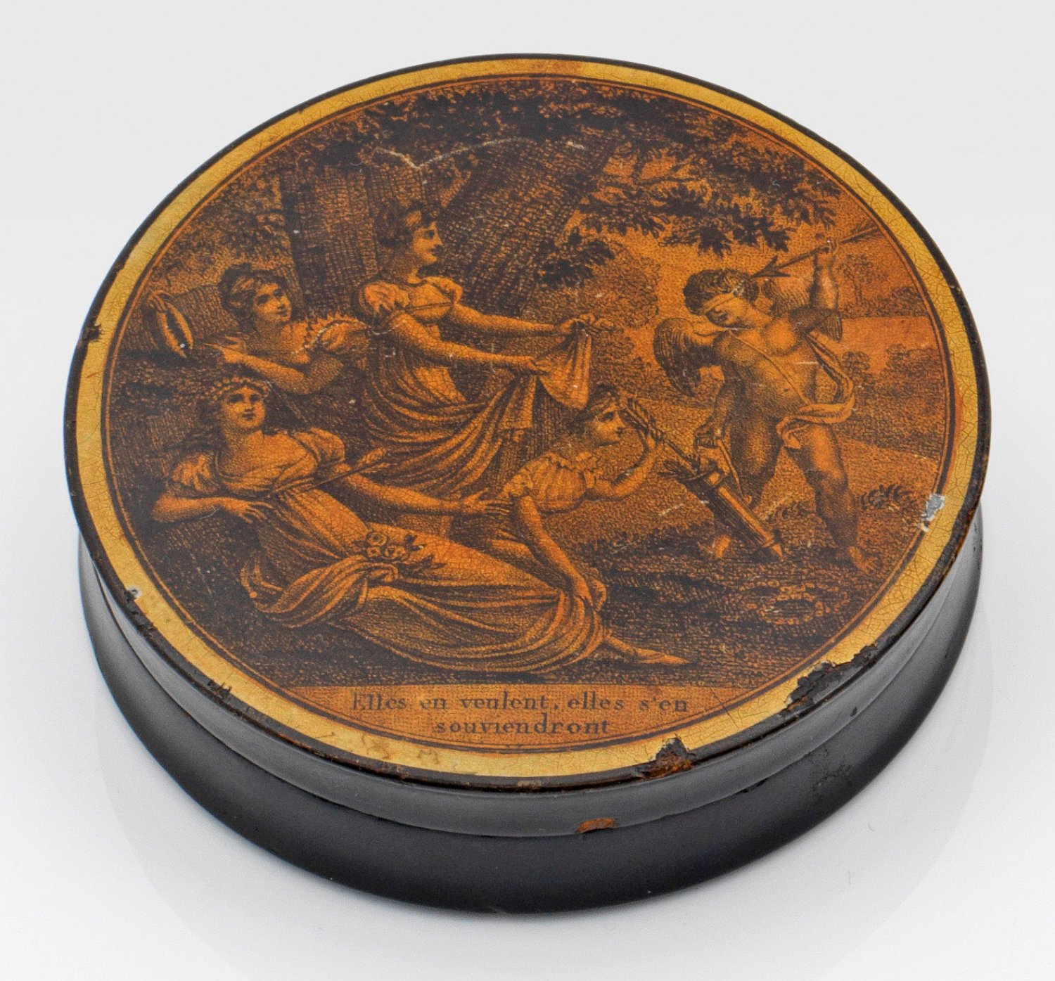 Pappmaché, schwarz lackiert. Innen Schildpatt. Rund, mit eingezogener Wandung. Auf dem Deckel Kupferstich mit Darstellung einer Gruppe junger Damen in hochtaillierten Empire-Kleidern flirtend, mit den Pfeilen von Amor spielend. Amor mit seinem Köcher vor ihnen stehend, mit verbundenen Augen und leichtem Tuch bekleidet. Im Hintergrund eine weite baumbestandene Landschaft. Unterhalb bez. "Elles en veulent, elles s'en souviendront". Teilw. best.; H. 2,2 cm. D. 8,7 cm.