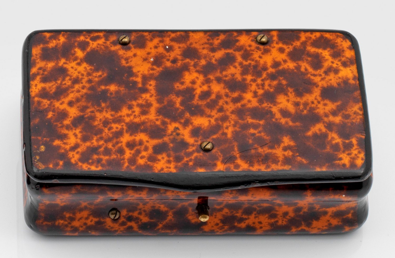 Holz, lackiert. Rechteckige Form mit eingezogener Wandung. Flächendeckend schwarz lackiert. Wandungsseiten und scharnierter Deckel mit orangefarbenem Grund und unregelmäßig gemaserten, dunkelbraunen Flecken in der Art von Schildpatt gestaltet. Innen dunkelrot lackiert. Minim. best.; H. 4,5 cm. 13 cm x 7,5 cm.