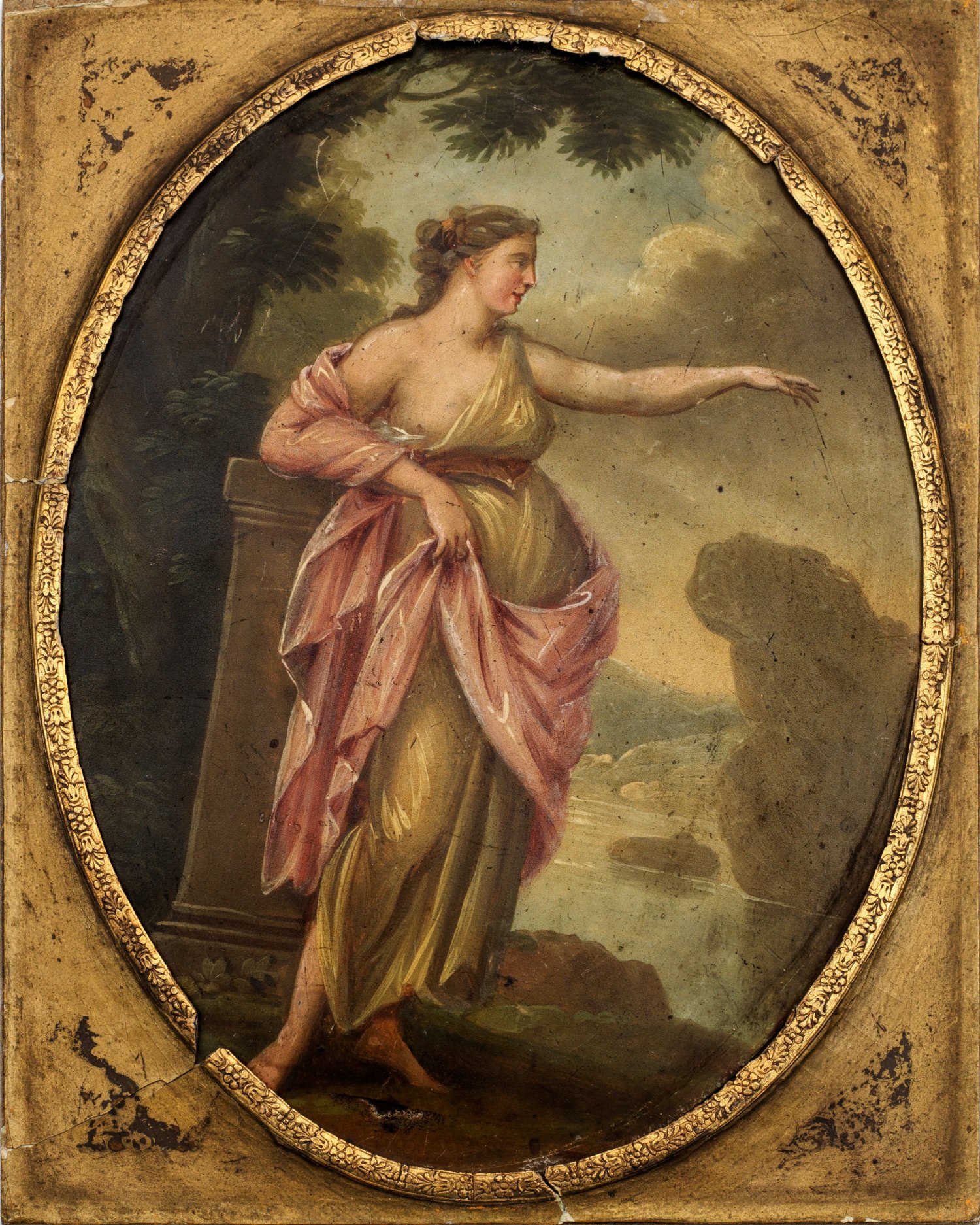 In gewölbtem Hochoval Darstellung der von Theseus zurückgelassenen Ariadne, an der Küste der Insel Naxos stehend. An eine Säule gelehnt, den Blick in die Ferne gerichtet und den linken Arm sehnsüchtig ausgestreckt. Bekleidet mit gelbfarbenem, antikem Kleid und lachsfarbener Stola. Im Hintergrund eine baumbestandene, felsige Küstenlandschaft. Rückseitiges Etikett mit teilw. unleserlicher dänischer Bez. "Ariade...(?) Maled af Meisner" sowie teilw. undeutliche, französische Widmungsinschrift und dat. "Souvenir de J. a. G. le 6 Octobre 1854...(?)". Polychrome Lackmalerei auf Weißblech. Rahmung aus vergoldetem Pappmaché mit floral ornamentierter Blende. 20,5 cm x 15 cm.