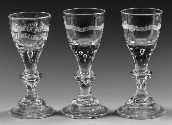 Three rare North German Lauenstein glass goblets with engraved mottos. Provenance: collection of the Royal House of Hannover.
