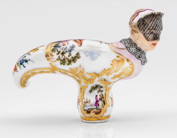 Gebogte Form, volutenförmig endend. Gegenüber plastischer Frauenkopf mit blondem Haar und weißer Spitzenhaube. Vor dem Gesicht schwarzer, tüllartiger Halbschleier und um den Hals korrespondierender Kragen. Auf der Wandung feine szenische Darstellungen mit galanten Paaren vor parkähnlichen Seenlandschaften mit Schloss im Hintergrund gerahmt von reliefiertem Rocailledekor in Goldmalerei sowie farbiges Blumenbukett und gestreute Blüten. Feine polychrome Malerei. L. 12 cm.