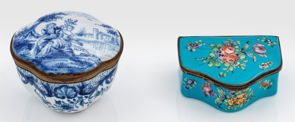 Email sowie Fayence. Passig geschweifte Form. Die Fayence-Tabatiere weiß glasiert, mit Messingmontierung. Auf dem Deckel in Blau dargestellte Landschaft mit Figurenstaffage. Auf der Wandung umlaufend floraler Dekor mit Muschelwerk. Die Email-Tabatiere verziert mit polychromen, erhabenen Blütendarstellungen und Goldmalerei über hellblauem Grund. Minim. best.; Teilw. mit Fabrikmarke. 3,5 cm - 6,5 cm.