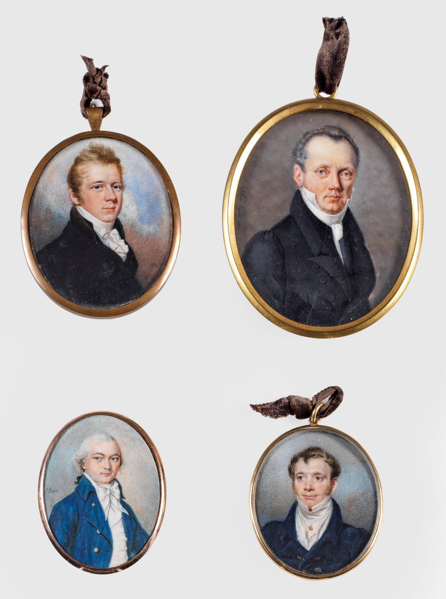 Brustbildnisse u. a. von Robert Malcolm, der zwischen 1781 und 1809 im Dienst der East India Company in der ehemaligen britisch-indischen Provinz Madras als Richter tätig war sowie drei weitere elegant gekleidete Herren mit hohem, weißem Kragen und dunklem Gehrock. Feine Temperamalerei. Teilw. rücks. bez. und dat.; Sign. Sélina Dufour (1804-1851) und George Richmond (1809-1896) sowie monogr. wohl für J.T.D. Beaumont (1747- ca. 1804) und "JL". Ein Porträt gerissen. Rahmen. 6 cm - 9,5 cm.