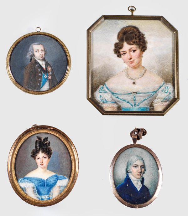 4-tlg.; Zwei Brustbildnisse von jungen Damen in tiefdekolletierten Kleidern mit kunstvollen Hochsteckfrisuren sowie das Bildnis eines jungen Herren in blauem Gehrock sowie wohl das Brustbildnis des russischen Staatsmannes und Kunstmäzens Nikolai Borissowitsch Jussupow (1750 - 1831), gekleidet mit Orden geschmücktem Gehrock. Feine Temperamalerei. Rückseitig mit hinter Glas geflochtenem Haar und Spruchband "Mir und Dir heilig". Ein Porträt sign. Frédéric Millet (1786-1859) und besch.; Rahmen. H. 6,5 cm -10,5 cm.
