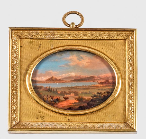 Im Oval die atmosphärisch friedliche Darstellung einer weitläufigen, leicht hügeligen Landschaft mit See und darauf schemenhaft angedeuteten Segelbooten in ein teilw. mit Schnee bedecktes Gebirgsmassiv mündend. Im Vordergrund mehrere Gehöfte sowie zwei Hirten mit Kühen und Schafen. Weiter Himmel mit teilw. roséfarben angeleuchteten Wolken. Äußerst feine Temperamalerei auf Weißblech. Breiter, rechteckiger und guillochierter Rahmen aus vergoldetem Messing umzogen von muschelförmigem Ornamentband. Mit Öse. 9,3 cm x 7,7 cm. Bildausschnitt 6 cm x 4,5 cm.