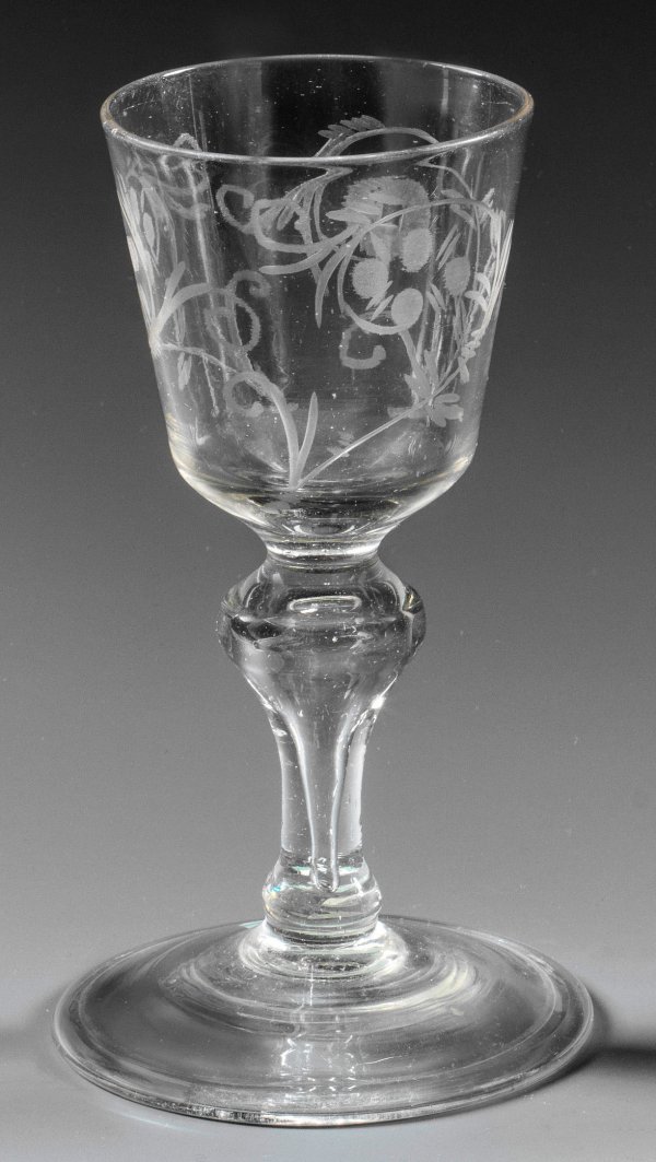 Leicht ansteigender Fuß, umgeschlagener Rand, im Balusterschaft eine große, eingestochene Luftblase. Auf der konischen Kuppa geschnittener Dekor aus Blumenranken. H. 14,8 cm.