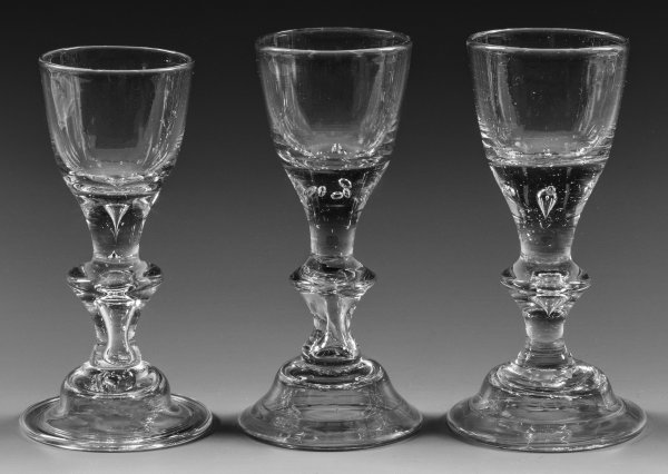 Farbloses Glas, Glockenfuß mit teilw. ausgeschliffenem Abriss und umgeschlagenem Rand, im Balusterschaft und Ansatz der konischen Kuppa eingestochene Luftblasen. Ein Pokal mit Löwenmarke. H. 16,8 cm-17,5 cm.