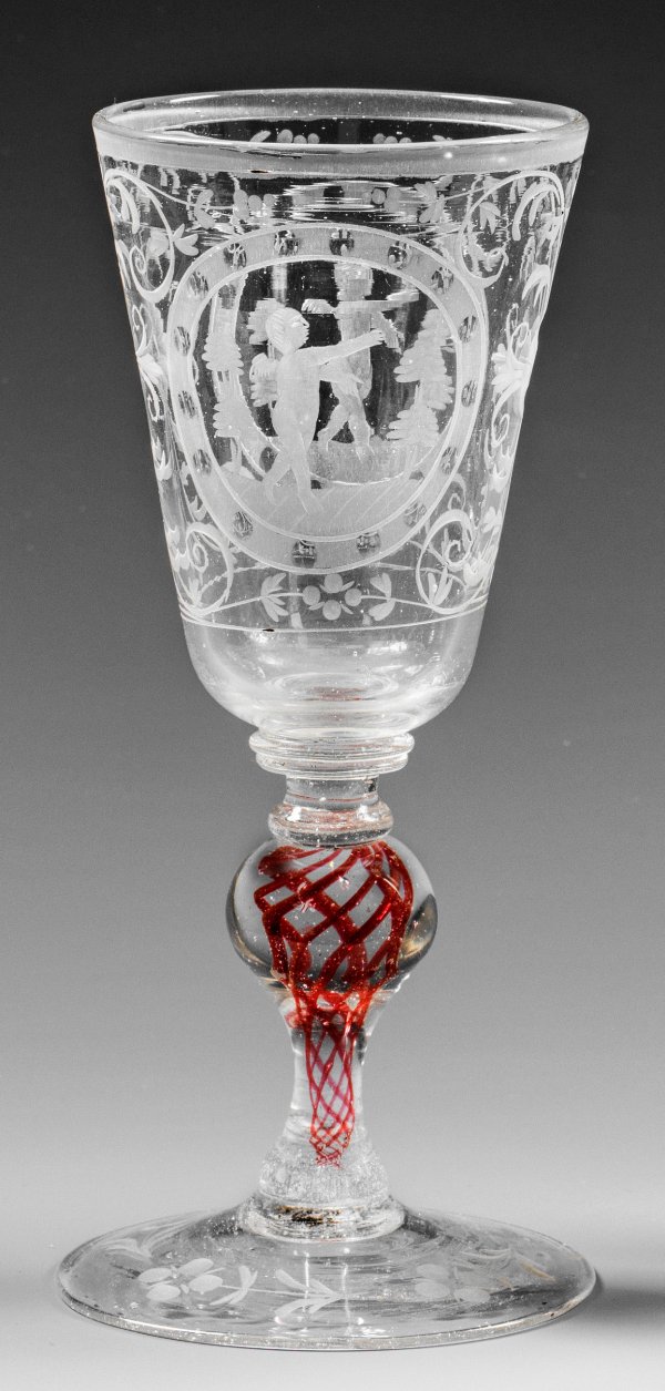 Farbloses Glas. Leicht ansteigender Scheibenfuß, im Balusterschaft Spiral-Goldrubinfäden. Schnittdekor kombiniert mit Blankperlen, auf der konischen Kuppa zwei Rundmedaillons mit tänzelnden Amoretten, die Fläche mit Blüten und Ranken. H. 17,2 cm.
