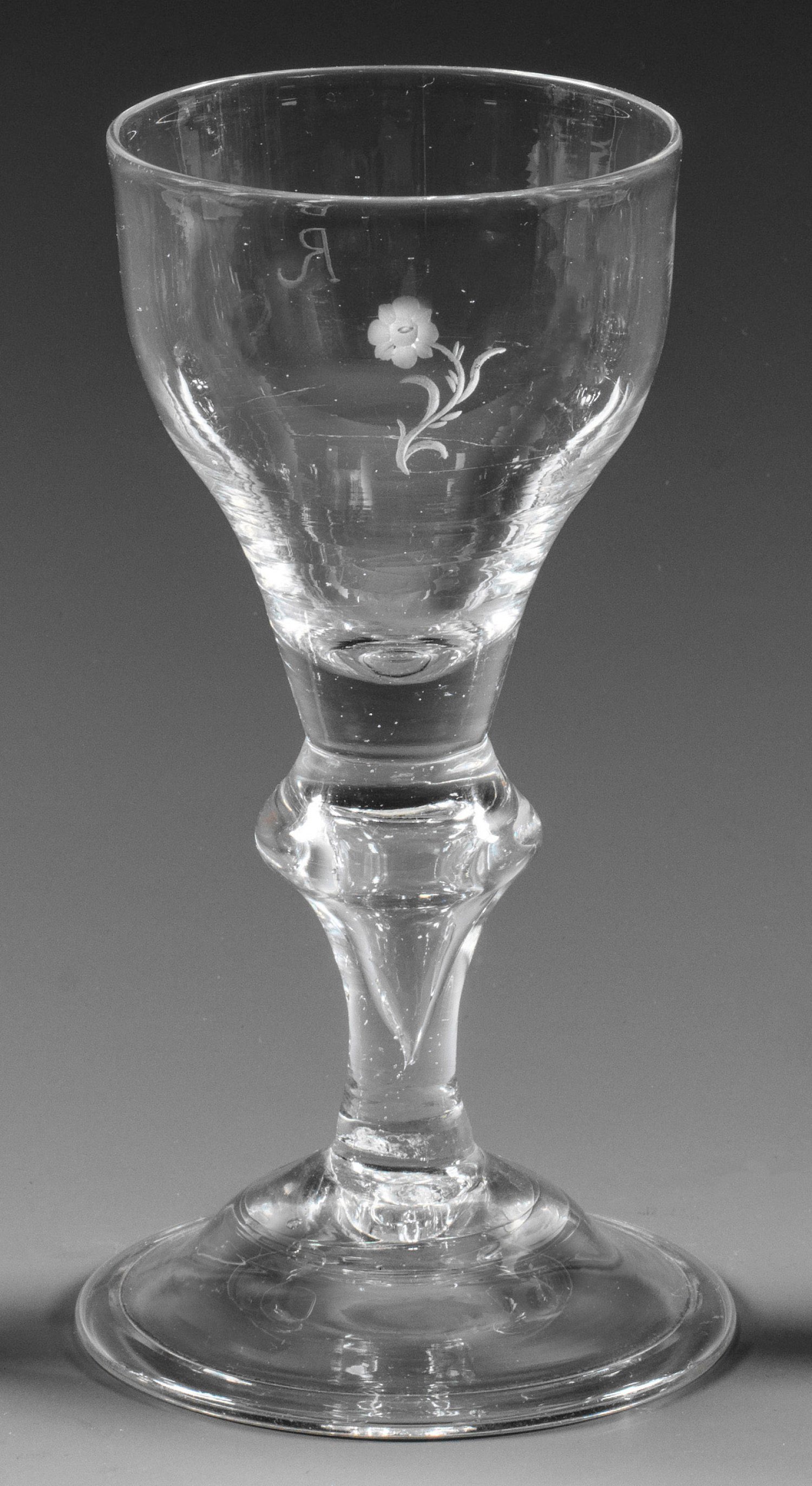 A North German or North Hessian glass goblet with engraved flower and monogram.