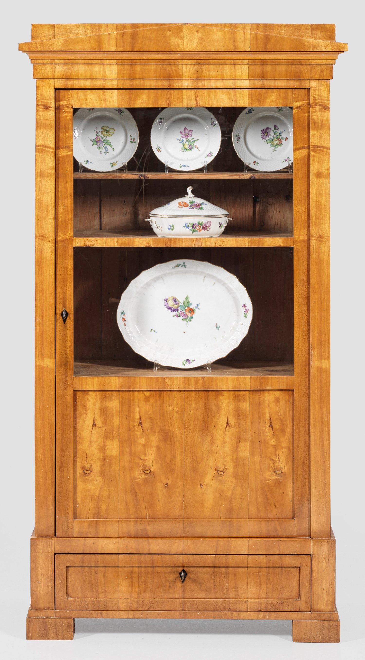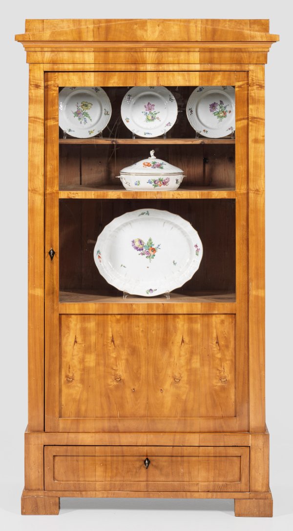 Kirschbaum, furniert. Gerader, hochrechteckiger Korpus auf einschübigem Zargensockel und gekanteten Füßen. In der Front Vitrinentür. Profiliertes Gesims mit flachem Schinkelgiebel. H. 173 cm. 92,5 cm x 43 cm.