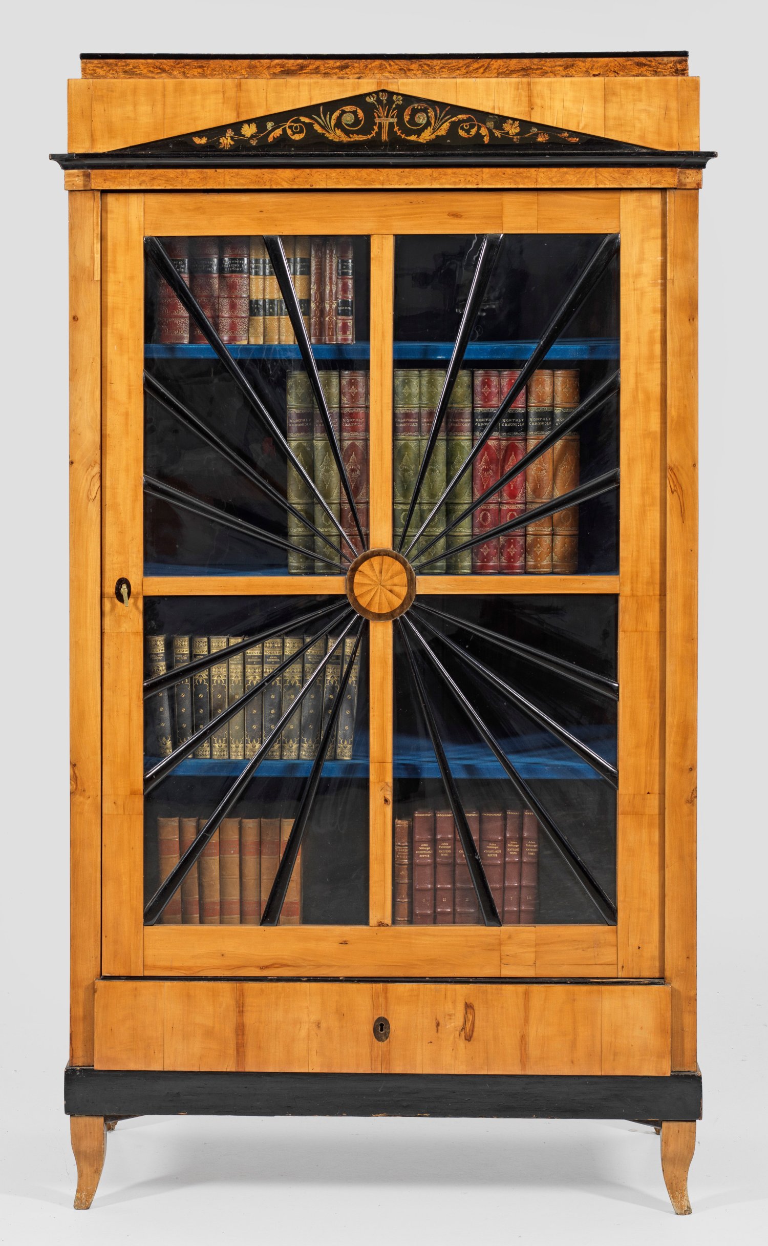 Birnbaum und Wurzelnuss, furniert und teilw. ebonisiert. Gerader, hochrechteckiger Korpus auf leicht geschweiften Beinen. In der gegliederten Front Blendschublade sowie Vitrinentür mit strahlenförmig angeordneten Sprossen. Gestuft ansteigender oberer Abschluss mit eingezogenem Schinkelgiebel. Erg.; H. 173,5 cm. 99 cm x 52 cm.