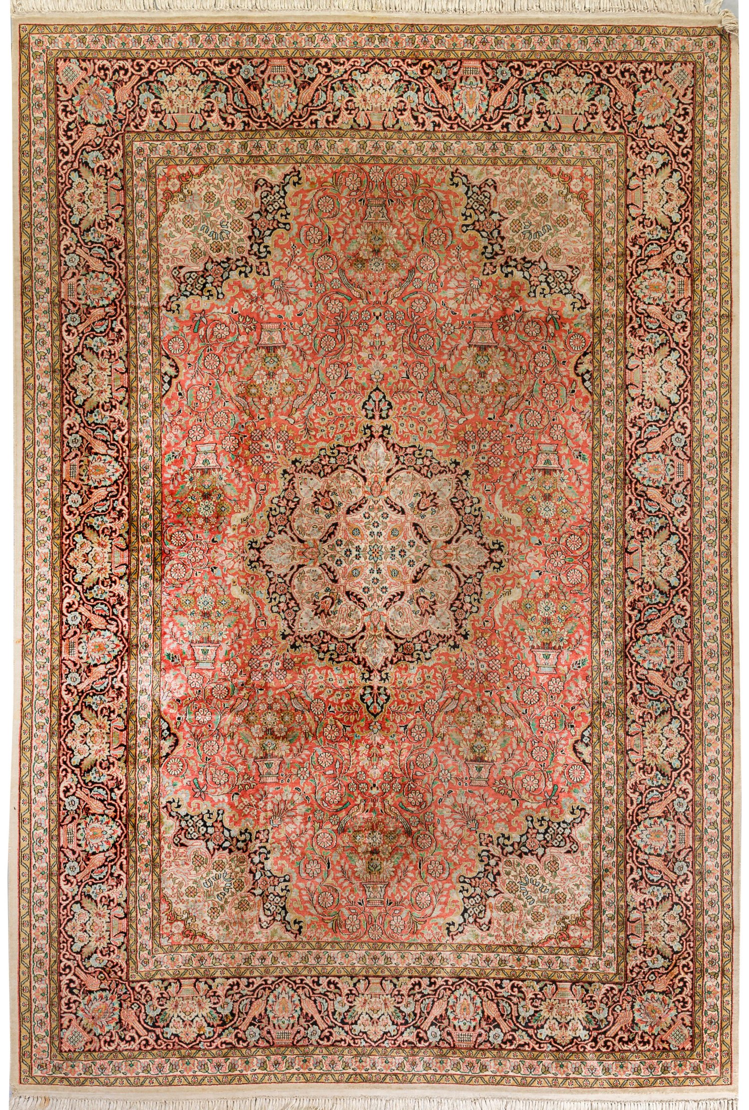 Indien. Mercerisierte Baumwolle auf Baumwolle. Im hellroten Innenfeld zentrales Rundmedaillon sowie entsprechende Ecklösungen. Flächendeckend dichte Blütenmusterung. Umlaufend breite, dunkelgrundige Bordüre aus Palmetten, flankiert von schmalen Borten. 188 cm x 284 cm.