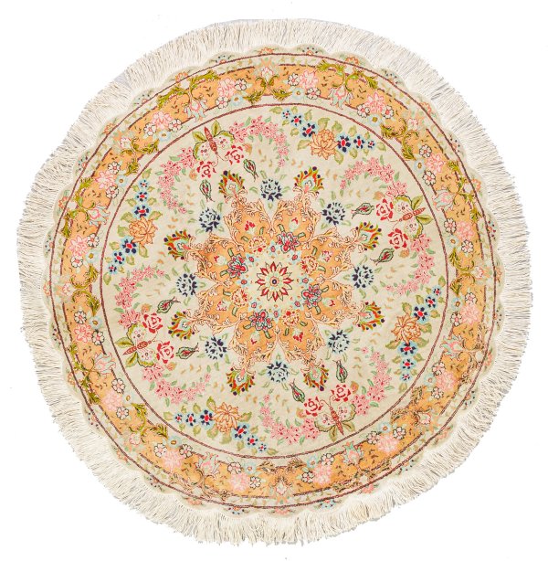 Persien. Seide auf Seide. Feine Knüpfung. Im cremefarbenen Innenfeld zentrales Medaillon mit Anhängern sowie flächendeckende Blütenmusterung in zarten Pastelltönen. Umlaufend breite korrespondierende Bordüre. D. 98 cm.