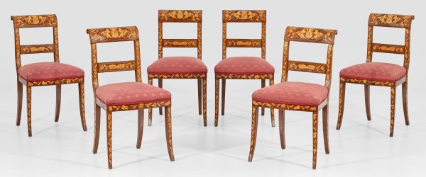Mahagoni, furniert sowie Einlagen aus unterschiedlichen Hölzern. Trapezförmige, schauseitig leicht bombierte Zarge auf ausgestellten Vierkantbeinen. Korrespondierende Rückenlehne mit breitem, leicht gewölbtem oberen Abschluss. Allseitig reicher Intarsiendekor aus Blüten und von Löwen flankierten Wappenkartuschen. Sitzfläche gepolstert und bezogen. Sitz-H. 49 cm.