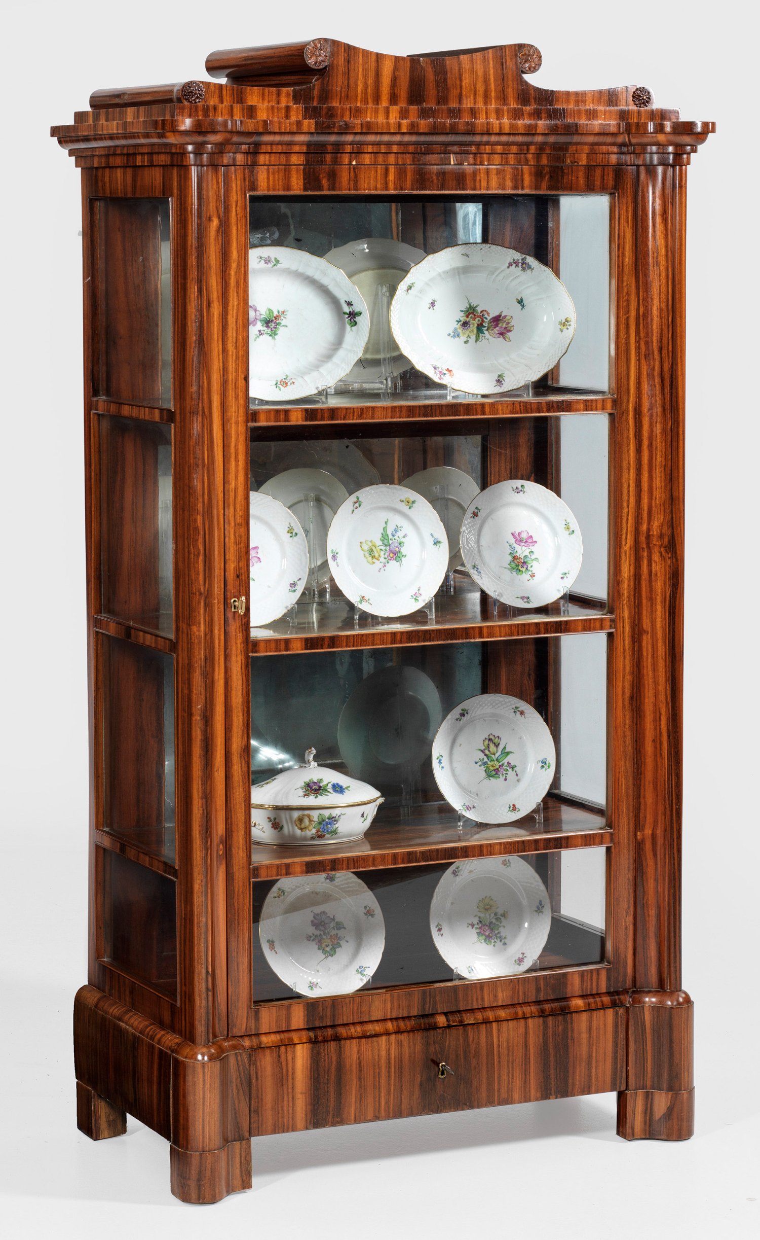 Palisander, furniert. Gerader, hochrechteckig angelegter, dreiseitig verglaster Korpus, flankiert von weit ausgezogenen, gerundeten Ecklisenen auf korrespondierendem, einschübigem Zargensockel und entsprechenden Füßen. In der Front eine große Vitrinentür. In den Ecken verkröpftes Gesims sowie geschweift ansteigender oberer Abschluss mit Blütenrosetten. Innen verspiegelte Rückwand. H. 174 cm. 93 cm x 50 cm.