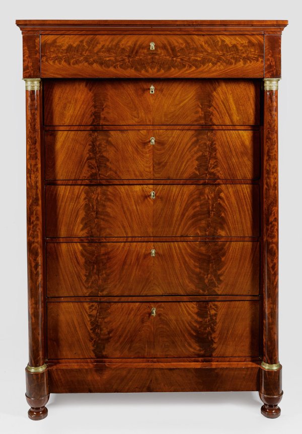 Mahagoni, furniert. Gerader, hochrechteckiger Korpus auf flacher Zarge und niedrigen Balusterfüßen. In der gegliederten Front sechs teilw. vorkragende Schubladen, flankiert von eingestellten Vollsäulen mit reliefierten Basen und Kapitellen. Gering überstehende, profilierte Deckplatte. H. 157 cm. 103 cm x 56 cm.