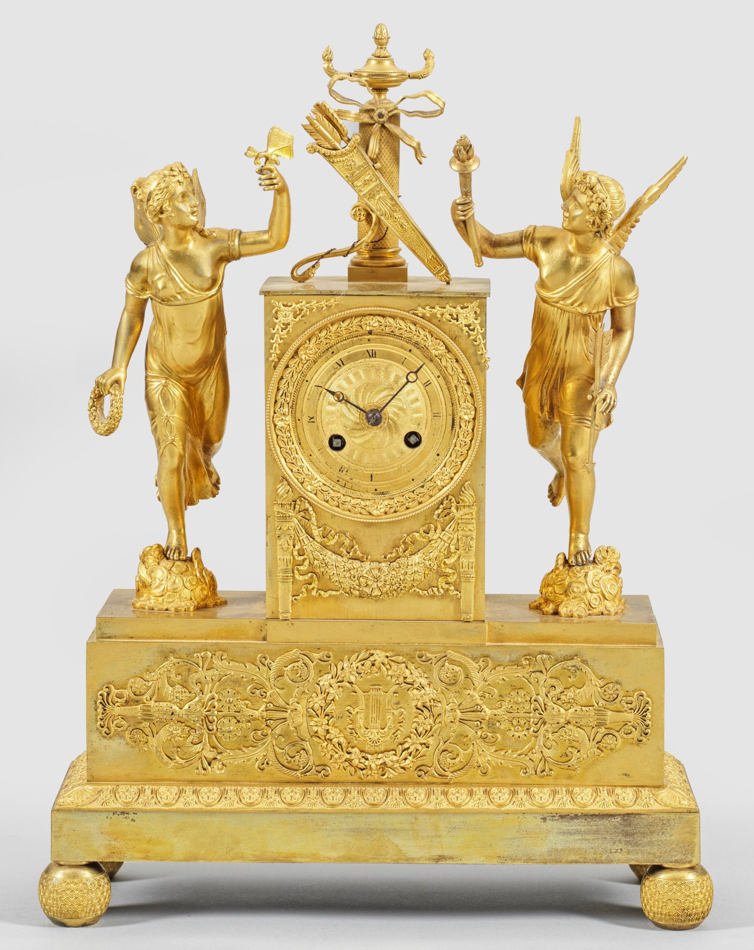 Bronze, vergoldet. Gerader, querrechteckig angelegter Korpus mit breitem Fries aus Palmetten auf reliefierten Rundfüßen. In der Front zentrales Lyramotiv mit Blütenkranz, umgeben von üppigen, eingerollten Voluten. Oberhalb rechteckiges Gehäuse mit guillochiertem Zifferblatt und Köcherbekrönung sowie vollplastische Darstellung von Amor und Psyche. Pendulenwerk mit Fadenaufhängung sowie Halbstundenschlag auf Glocke. H. 44 cm. 32 cm x 10,5 cm.