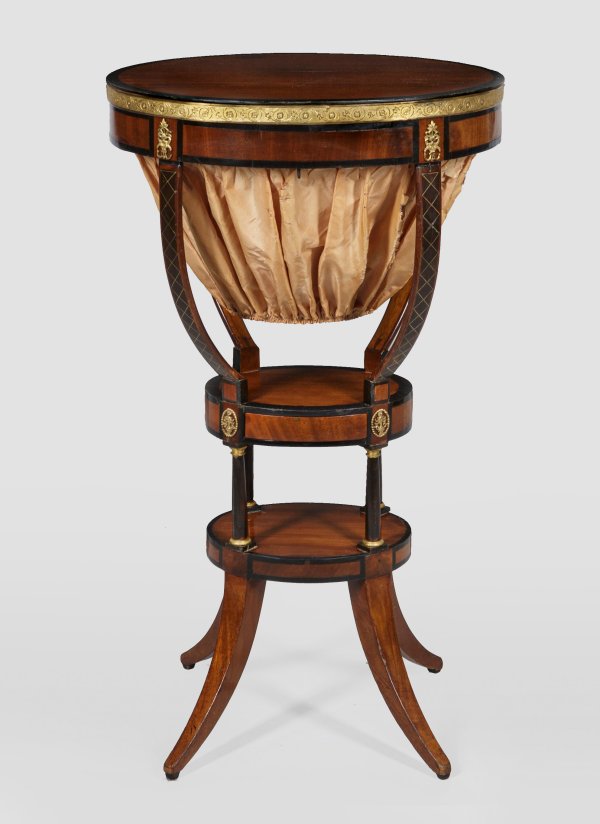 Mahagoni, massiv und furniert sowie teilw. ebonisiert. Applikationen aus vergoldeter Bronze. Über ausgestellten, spitz zulaufenden Vierkantbeinen ovale Ablagefläche sowie über konischen Säulen mit reliefierten Basen und Kapitellen, korrespondierender Kasten mit Geheimlade. Oberhalb gebogte Streben mit eingelegtem Gitterwerk aus feinen Messingbändern als Träger für bombierten Zargenkasten. Ovale, aufklappbare Deckplatte mit umlaufendem Fries aus eingerollten Voluten und Blüten. Innen Facheinteilung mit Geheimfächern sowie besch. Wollfach. H. 76 cm. 44 cm x 36 cm.