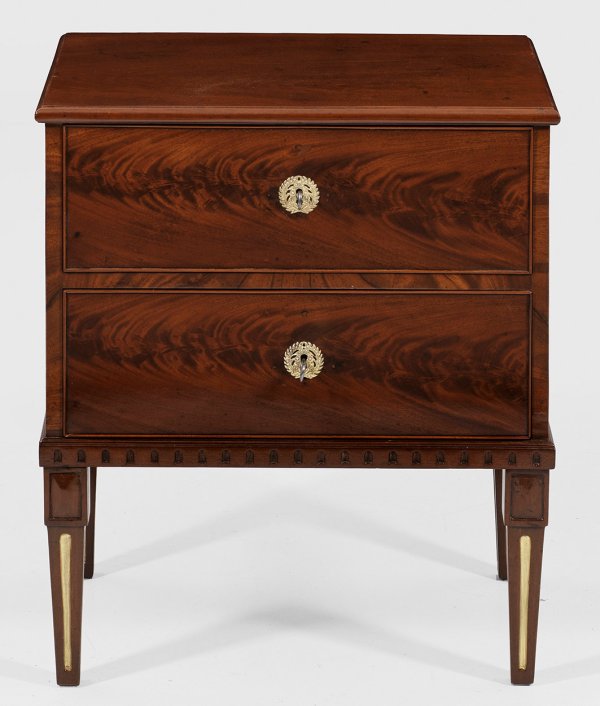 Mahagoni, furniert. Gerader, rechteckiger Korpus auf schmaler Profilzarge und gekanteten Beinen. In der gegliederten Front zwei Schubladen. Gering überstehende, profilierte Deckplatte. H. 72 cm. 61,5 cm x 41,5 cm.