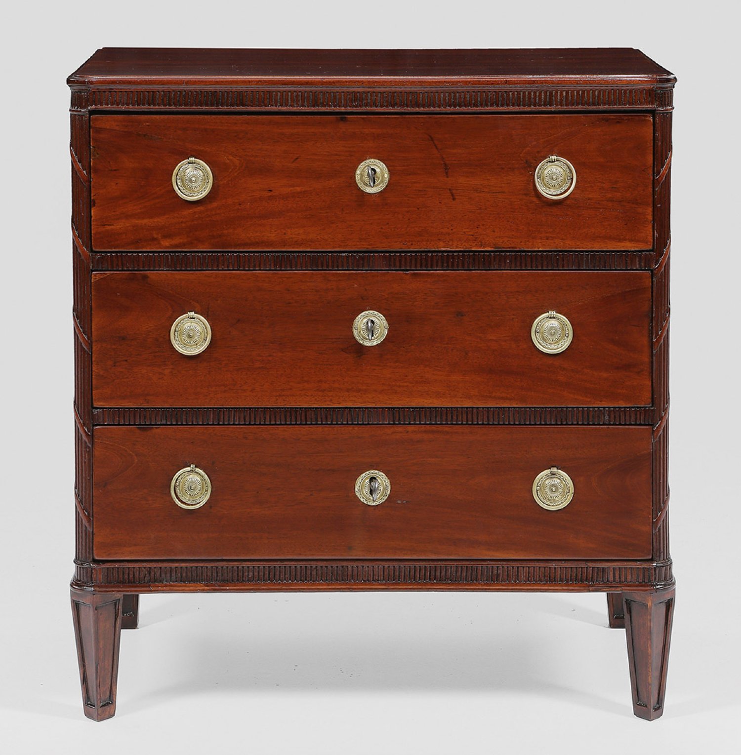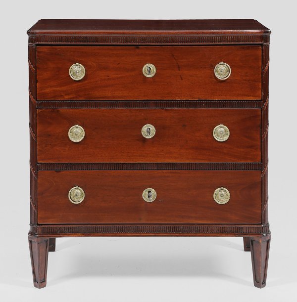 Mahagoni, furniert. Gerader, rechteckiger Korpus auf schmaler Profilzarge und konischen Vierkantfüßen. In der gegliederten Front drei Schubladen, flankiert von gerundeten, godronierten Ecklisenen. Dem Korpus entsprechende Deckplatte. H. 73,5 cm. 70,5 cm x 38,5 cm.