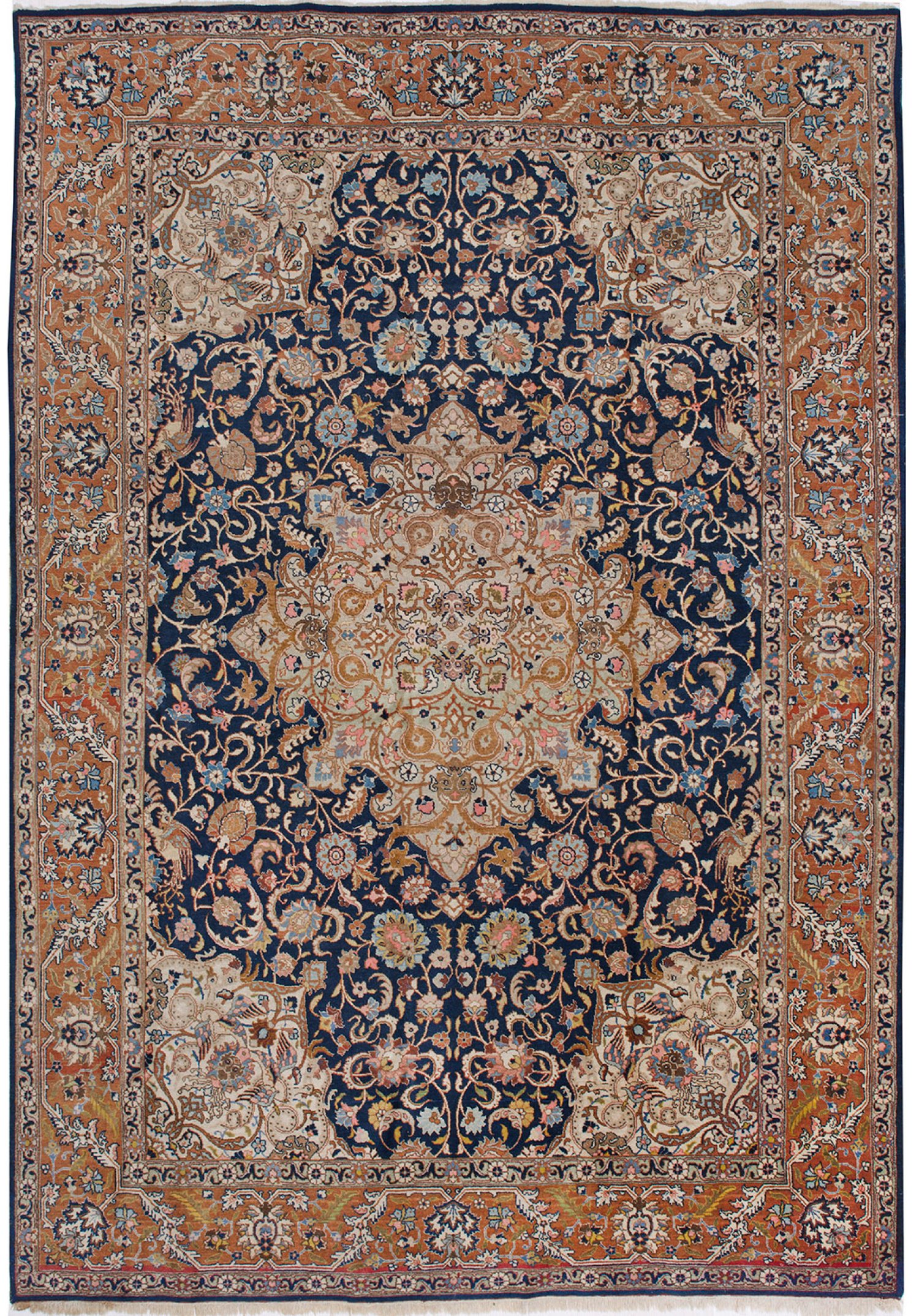 Persien. Wolle auf Baumwolle. Im dunkelblauen Innenfeld großes, beigefarbenes Rautenmotiv sowie passig geschweifte Ecklösungen. Flächendeckend dichte Musterung aus üppigen Blüten- und Blattranken. Umlaufend breite Bordüre aus Palmetten und Blattranken auf rotbraunem Fond. 402 cm x 283 cm.