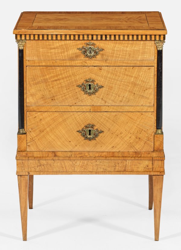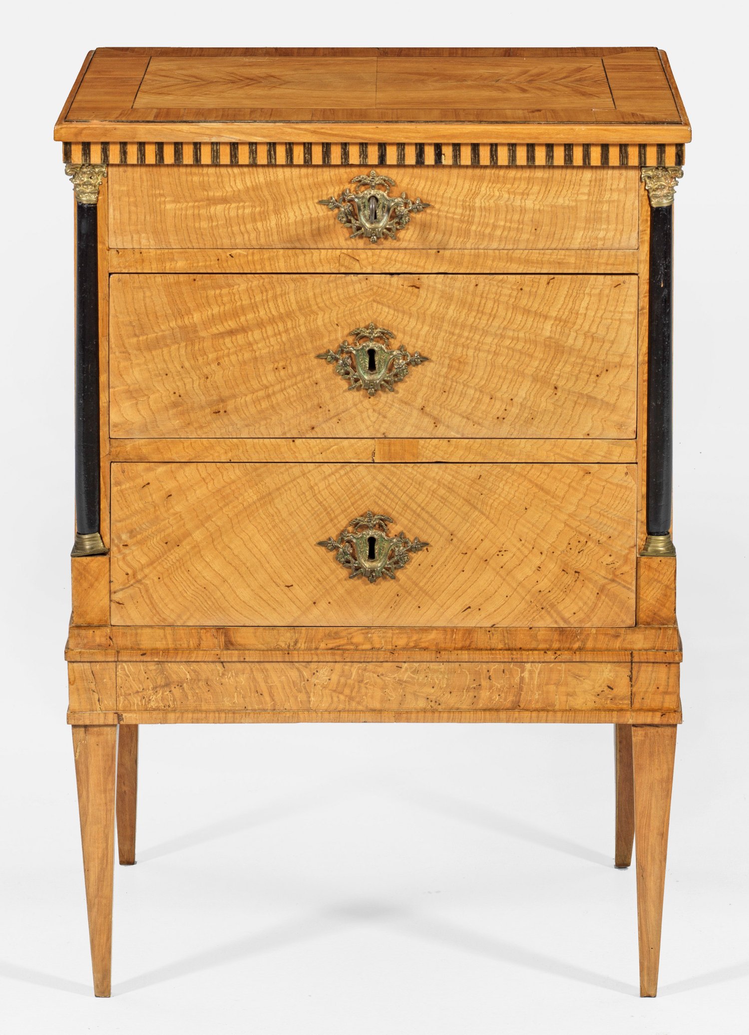 Eschenholz, furniert sowie teilw. ebonisiert. Gerader, rechteckiger Korpus, flankiert von schräggestellten Ecklisenen sowie eingestellten Halbsäulen mit korinthischen Kapitellen auf gerader Zarge und konischen Vierkantbeinen. In der gegliederten Front drei Schubladen unterschiedlicher Größe. Gering überstehende Deckplatte. Flächendeckende Furnierfelder, teilw. im Verlauf. H. 74 cm. 51,5 cm x 37 cm.
