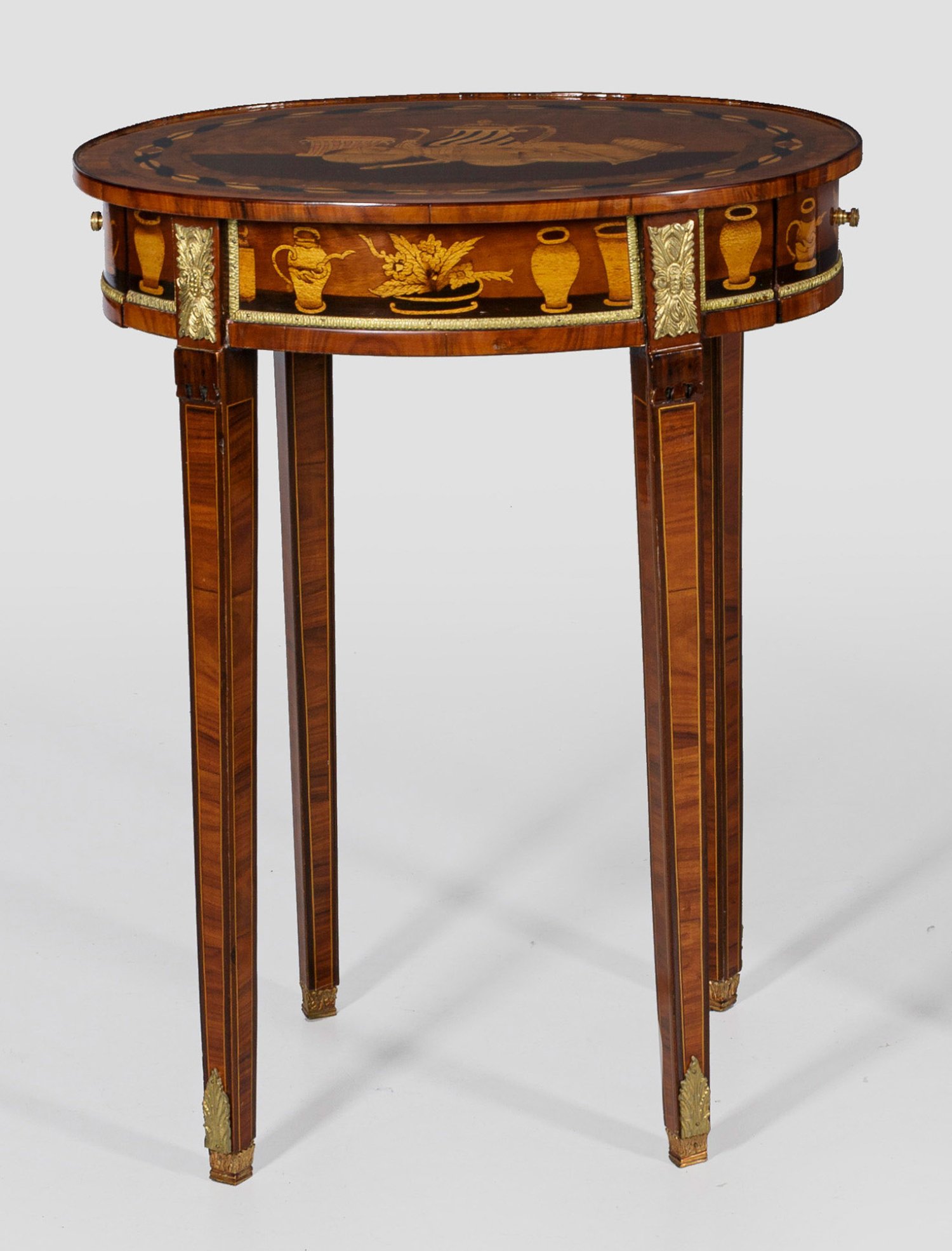 Nussbaum, furniert sowie Einlagen aus unterschiedlichen Edelhölzern. Bombierter, zweischübiger Zargenkasten auf hohen, konischen Beinen. Gering überstehende, ovale Deckplatte. Flächendeckende, teilw. stilllebenartig angeordnete Intarsienbilder aus Kannen- und Vasenmotiven. Applikationen aus Bronze. H. 74 cm. 58 cm x 44 cm.