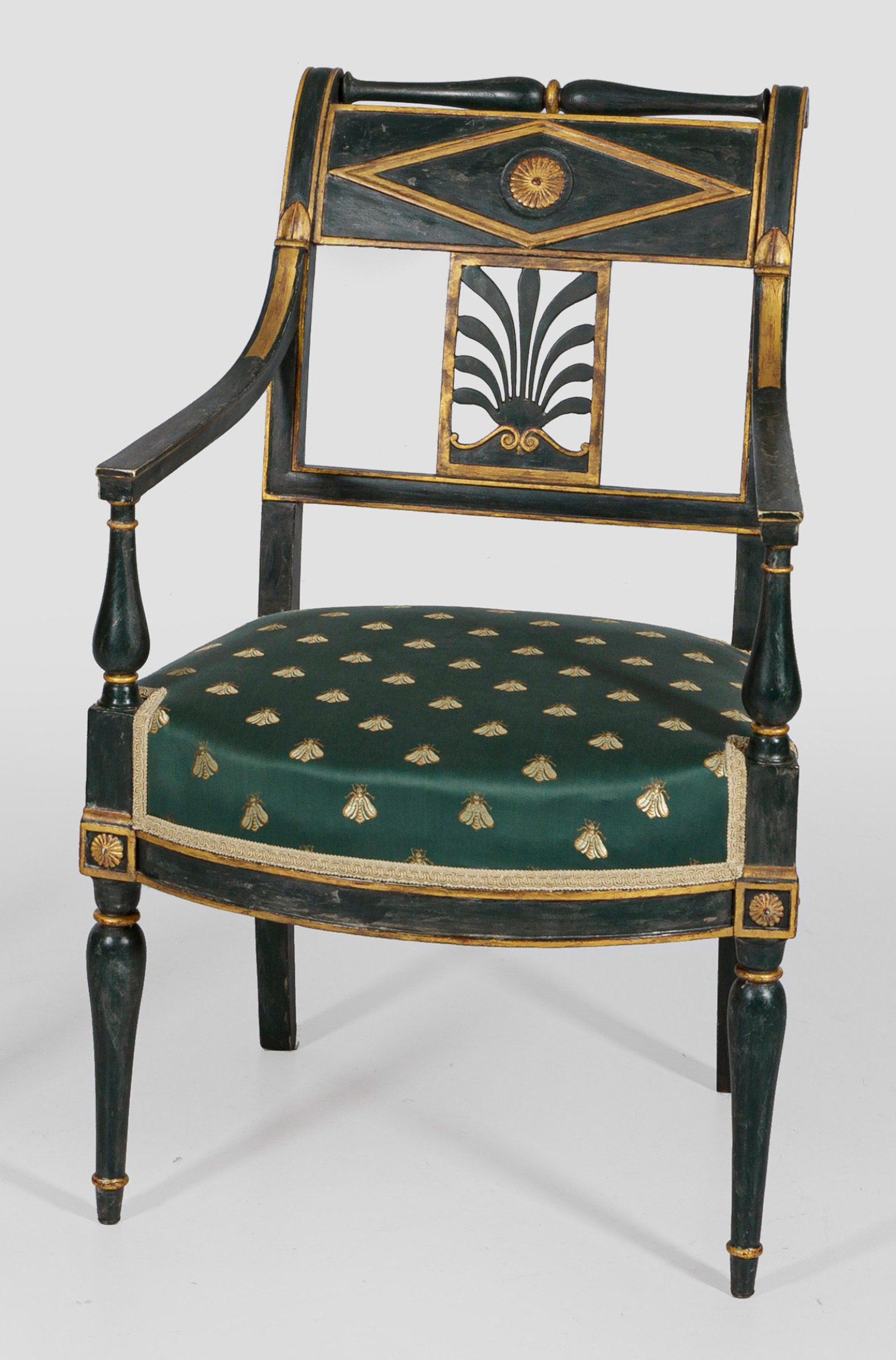 Holz, petrolgrün gefasst und teilw. vergoldet. Trapezförmige, in der Front bombierte Zarge auf schlanken Balusterbeinen. Korrespondierende Stütze für schmale, geschweift ansteigende Armlehnen. Zurückschwingende Rückenlehnenrahmung mit breitem oberen Abschluss, Balusterstab und durchbrochen gearbeitetem Mittelsteg aus stilisiertem Schilfblatt. Sitzfläche gepolstert und bezogen. Sitz-H. 43 cm.