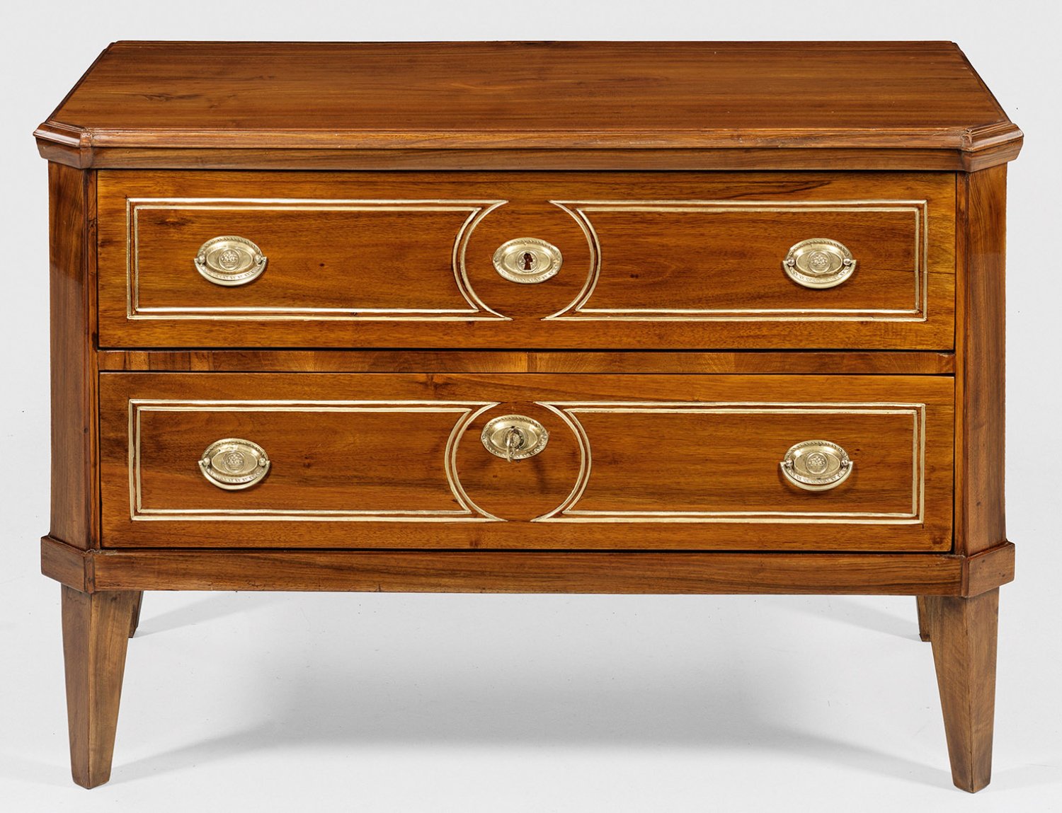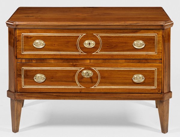Nussbaum, teilw, goldfarben gefasst. Gerader, querrechteckig angelegter Korpus, flankiert von schräggestellten Ecklisenen auf konischen Vierkantbeinen. In der gegliederten Front zwei breite Schubladen mit reliefiertem Dekor. Korrespondierende, gering überstehende und profilierte Deckplatte. H. 82,5 cm. 118 cm x 57 cm.